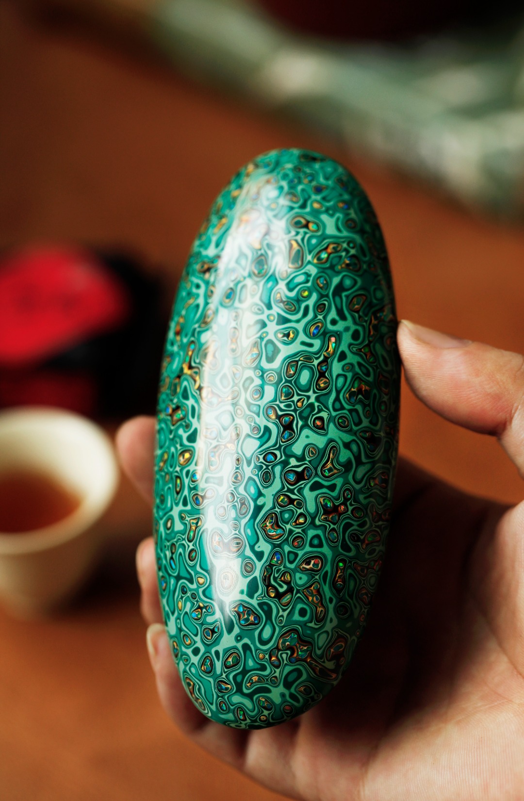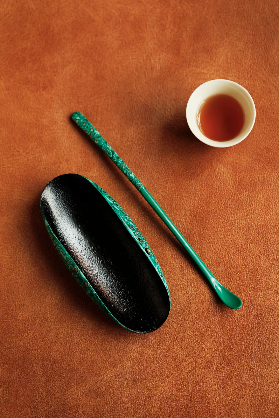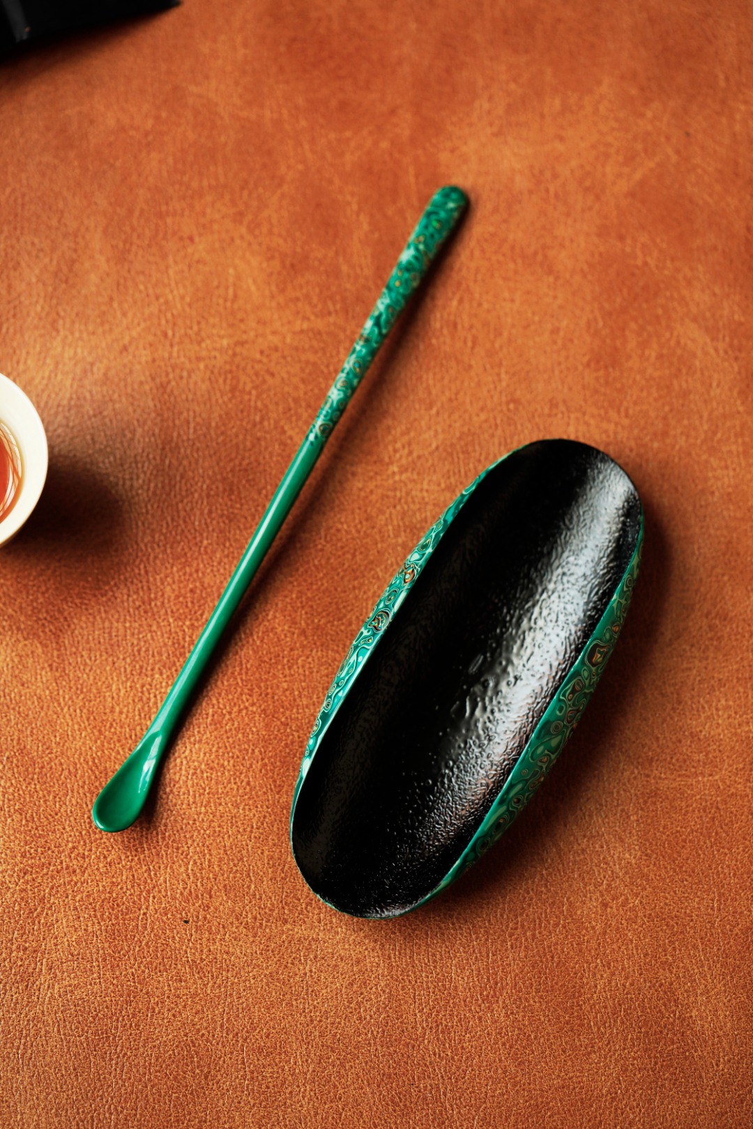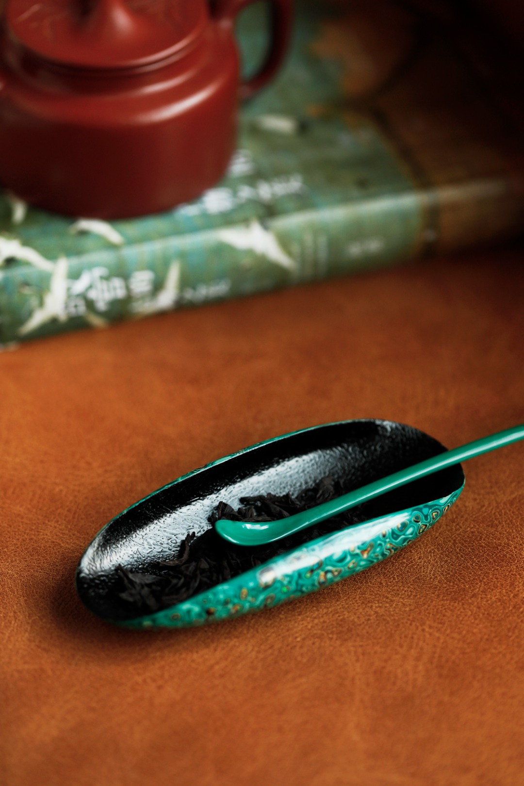 紫光檀为胎底,逐层髹漆,镶嵌多彩螺钿,斑斓多彩,反复推光打磨,触手温润细腻。入茶席之间,辅以茶事,百观不厌。