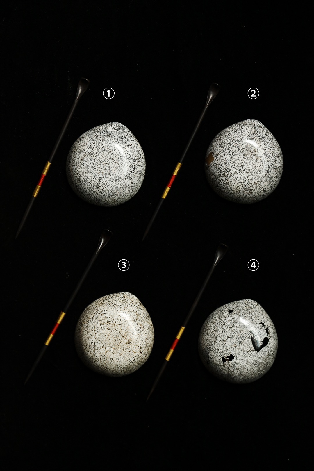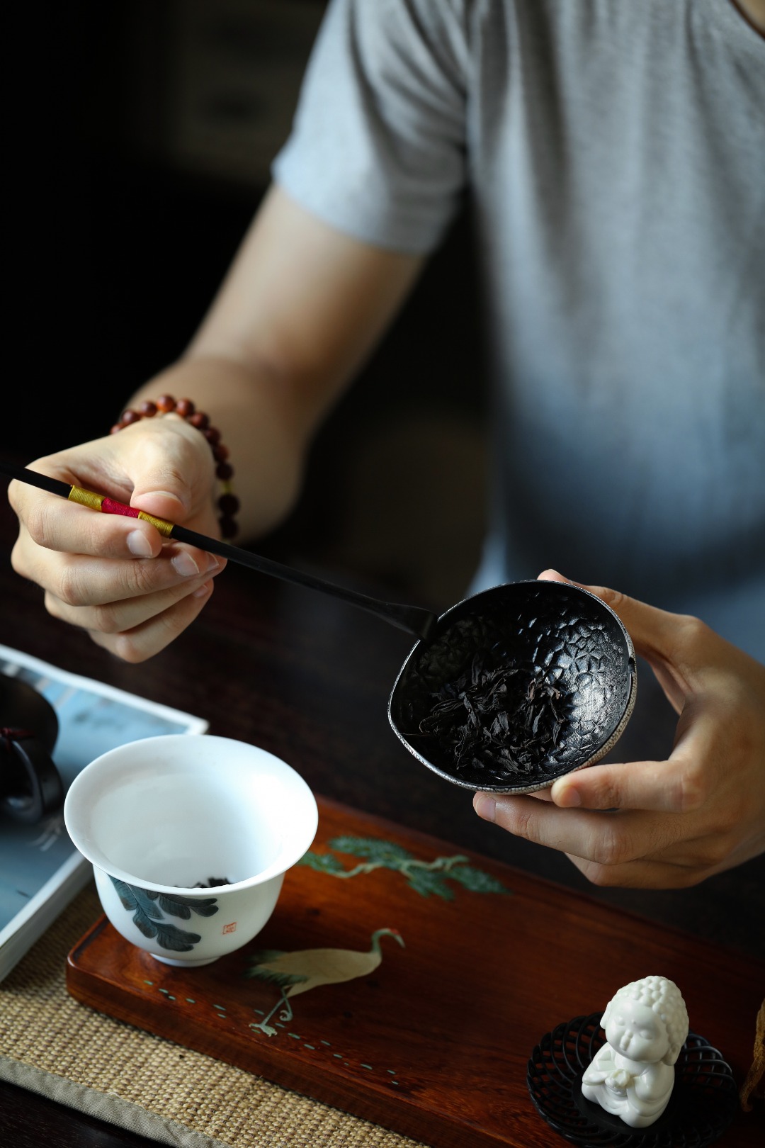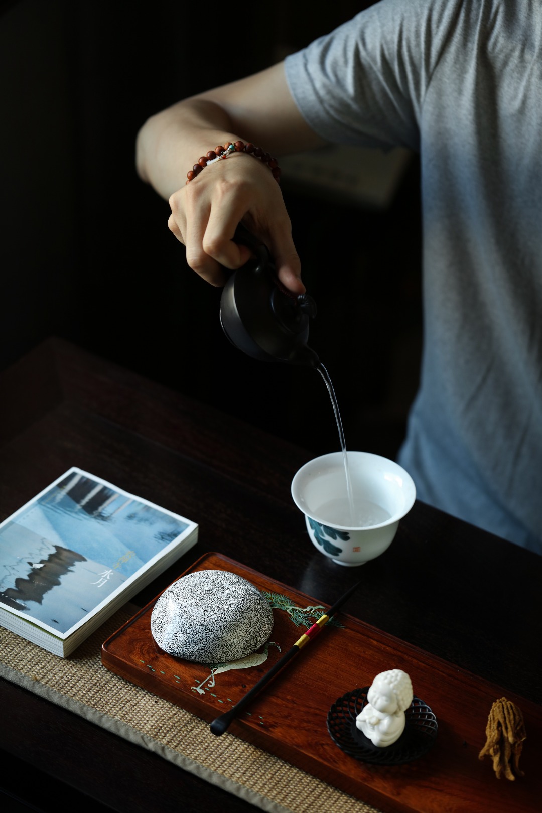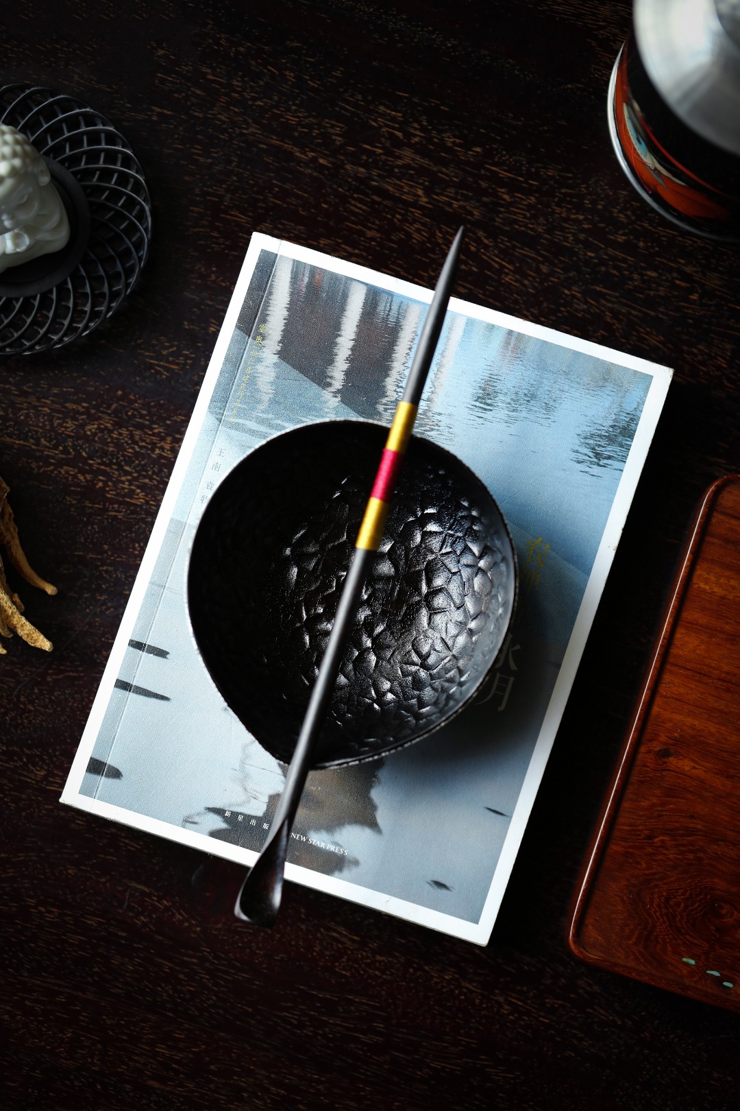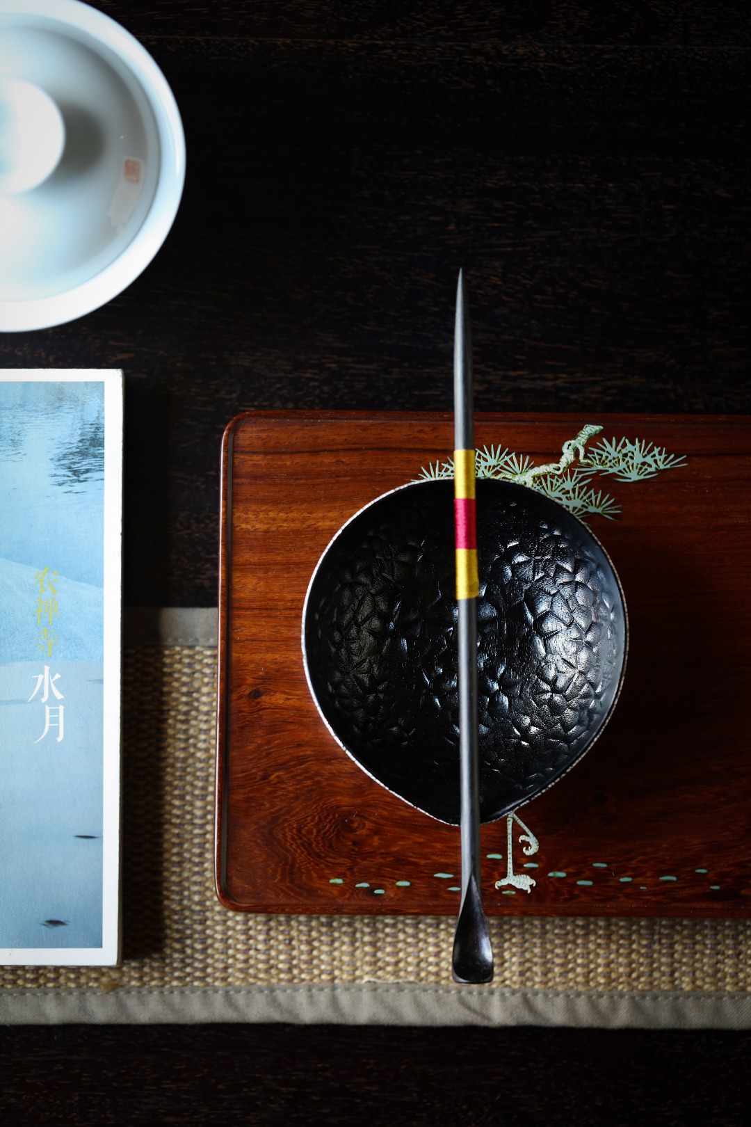紫光檀一木挖制,料质温润,器身以锤目纹为装饰,逐层髹漆打磨,蛋壳贴就,若冰裂开片,工艺繁复细致,辅以茶事,赏心悦目,茶房雅器。