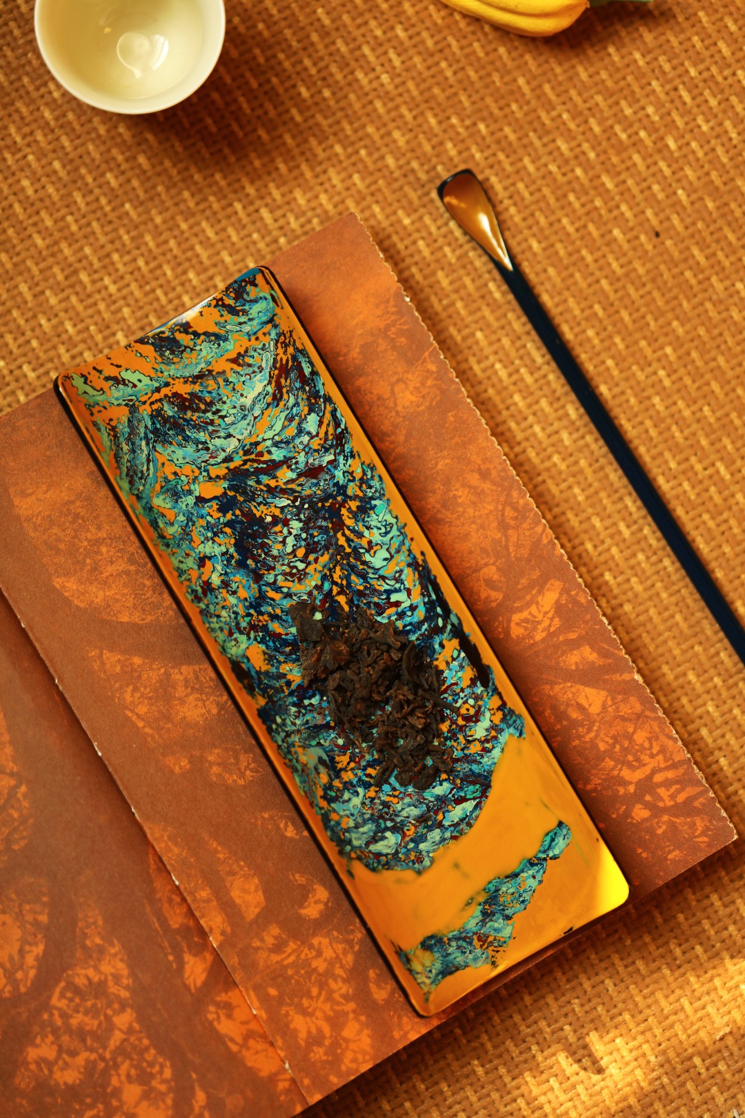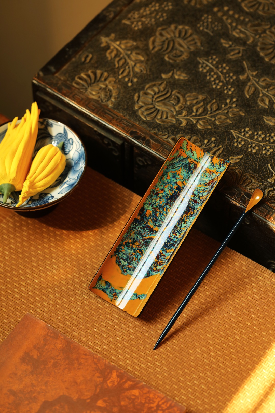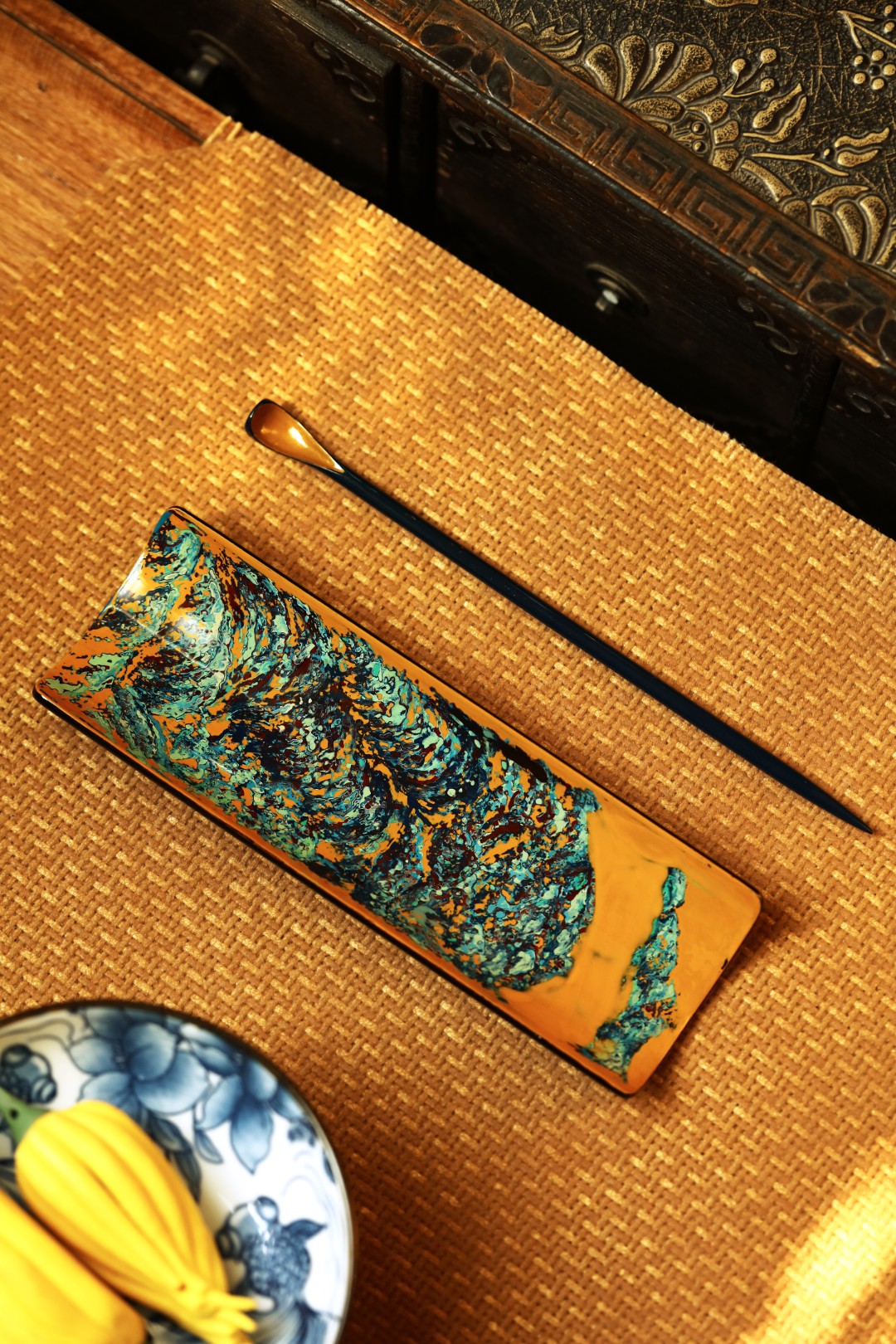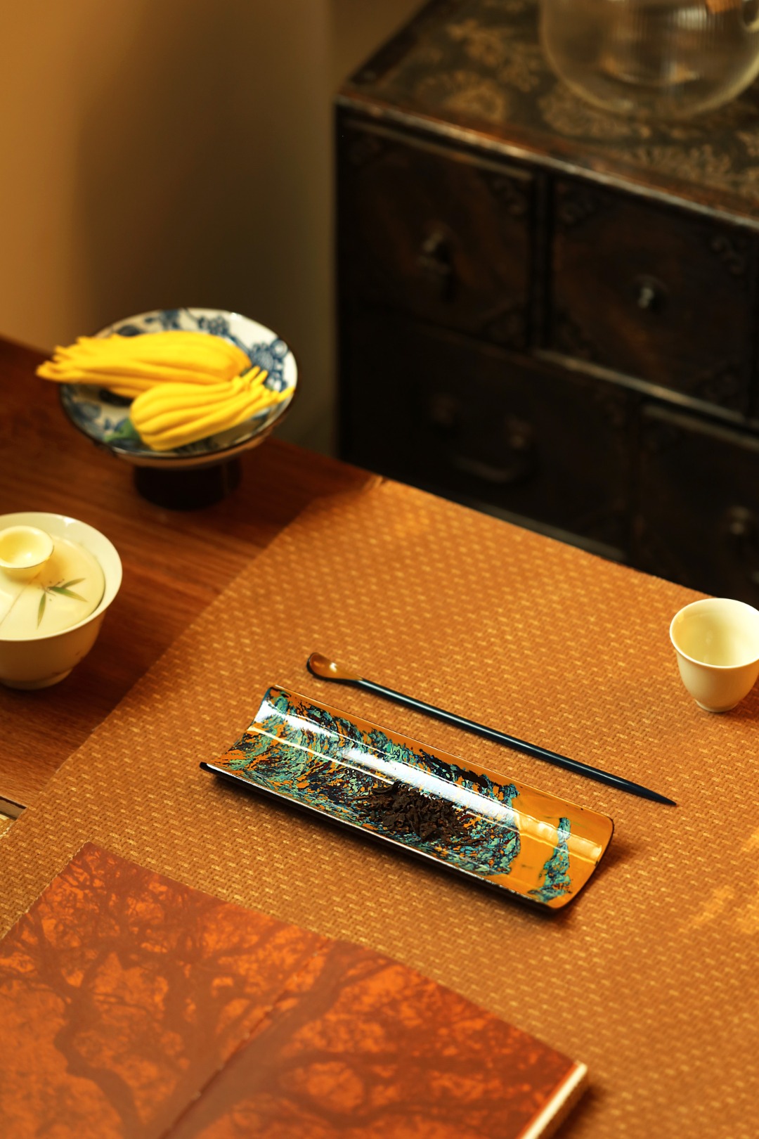 循传统工艺,逐层髹漆,斑斓多彩,宛若山河,反复推光打磨,触手温润细腻。入茶席之间,辅以茶事,百观不厌。