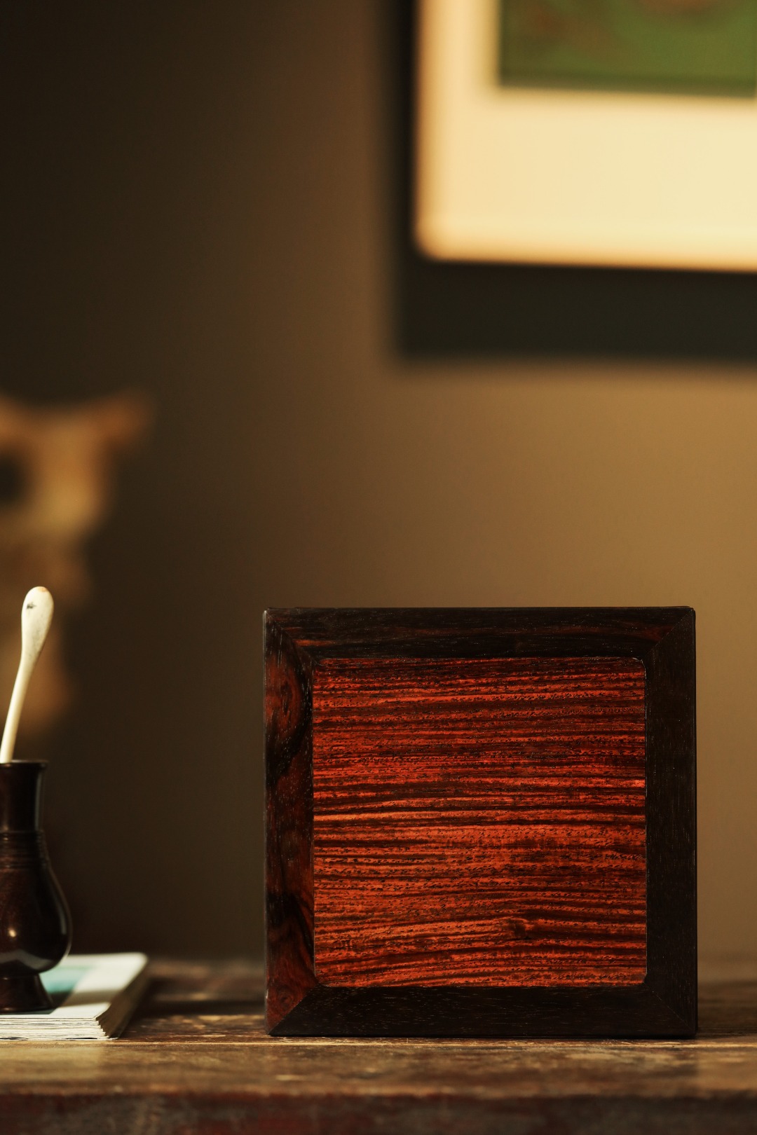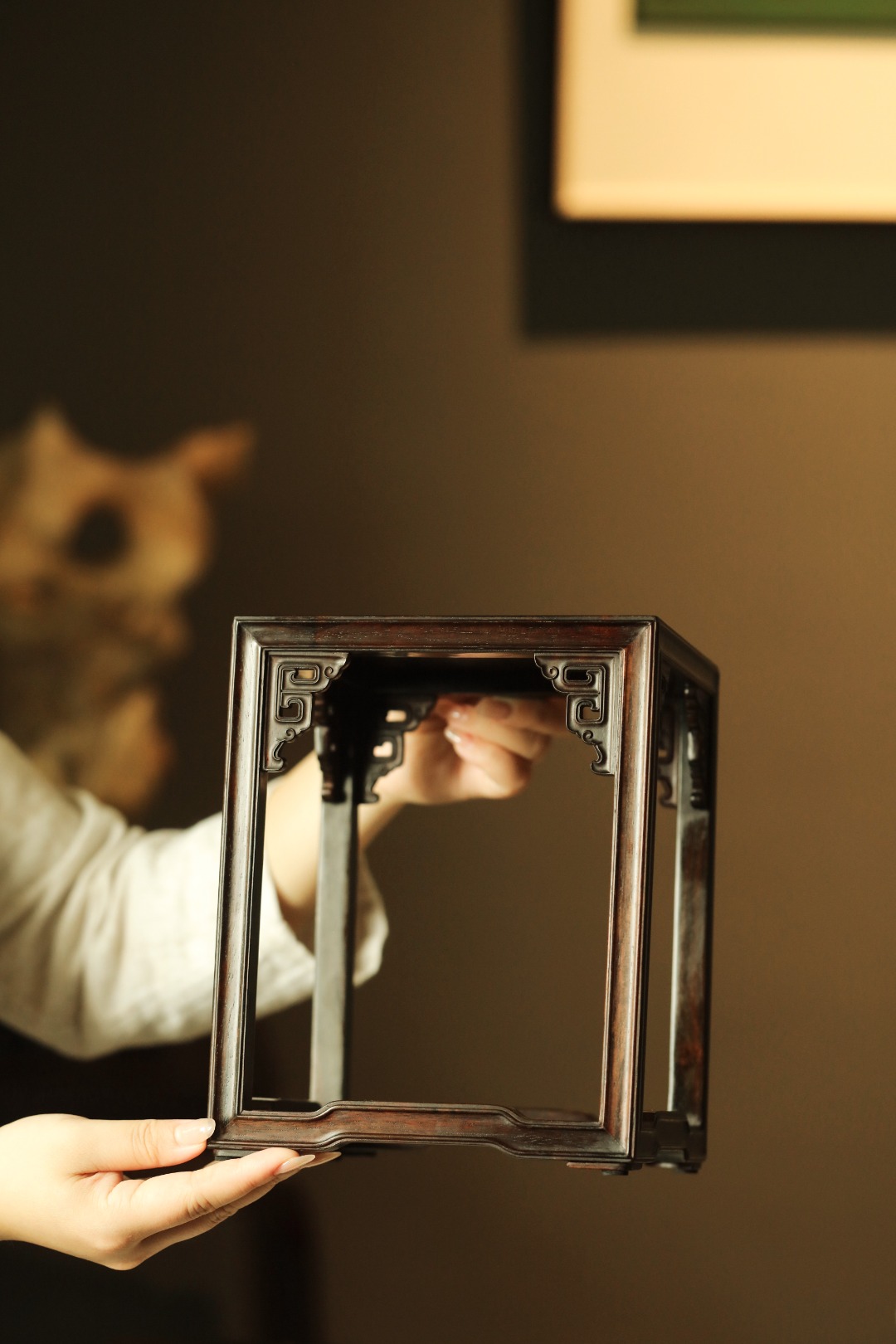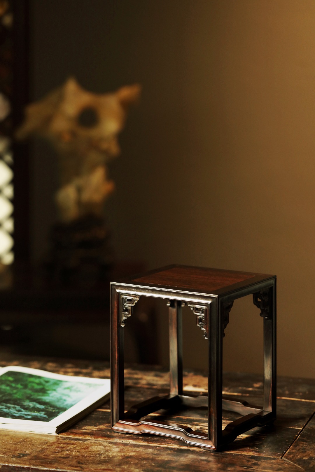 小几以大红酸枝制,几面大边以榫卯相交,四腿装饰拐子龙纹牙角,增加稳固性。下设罗锅形托泥与四足相交。制作考究。此小几应为桌上置物之用。