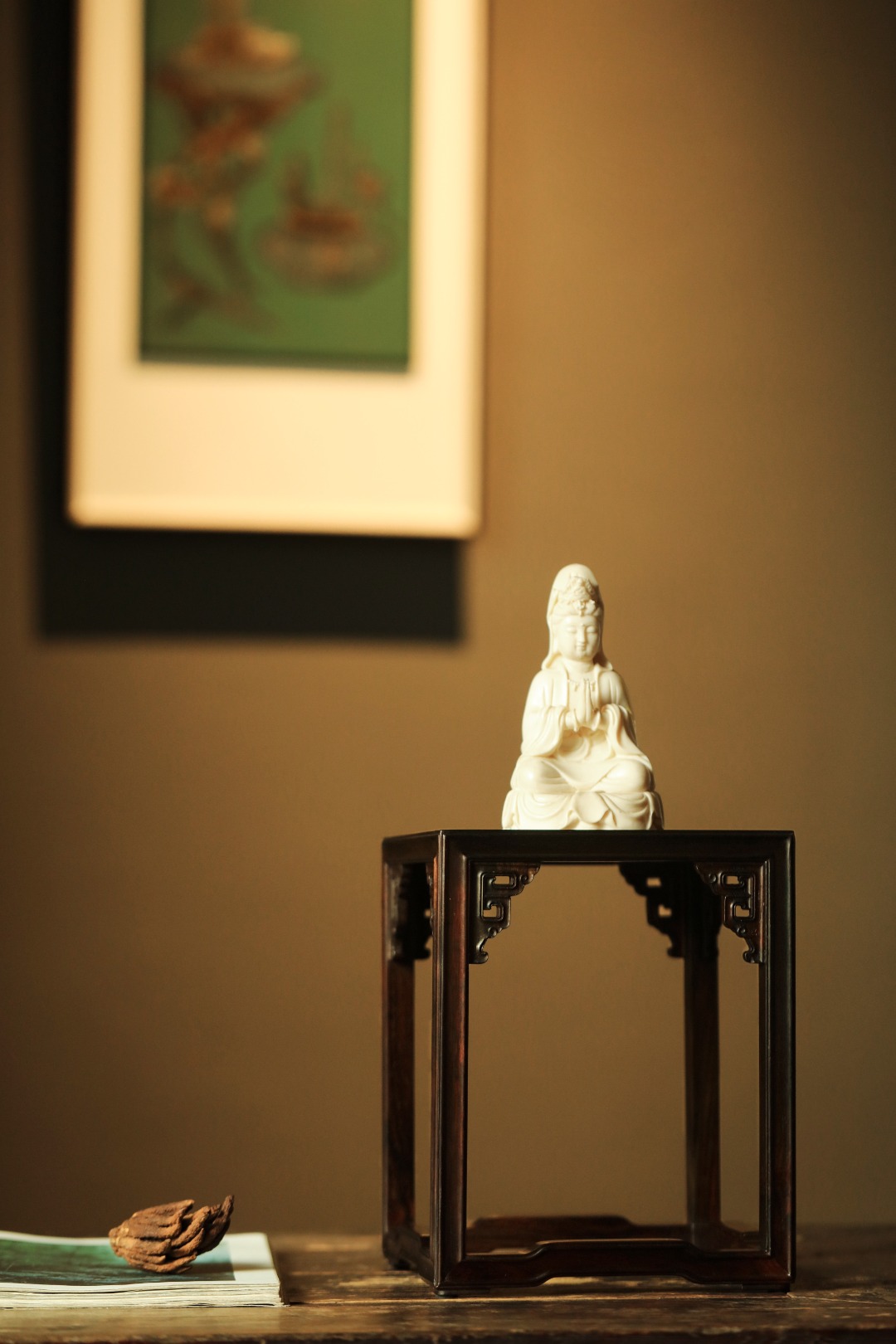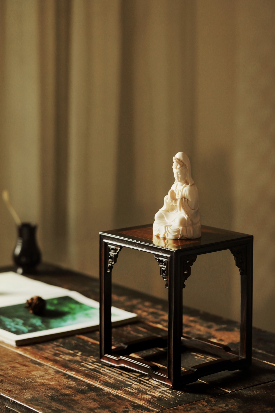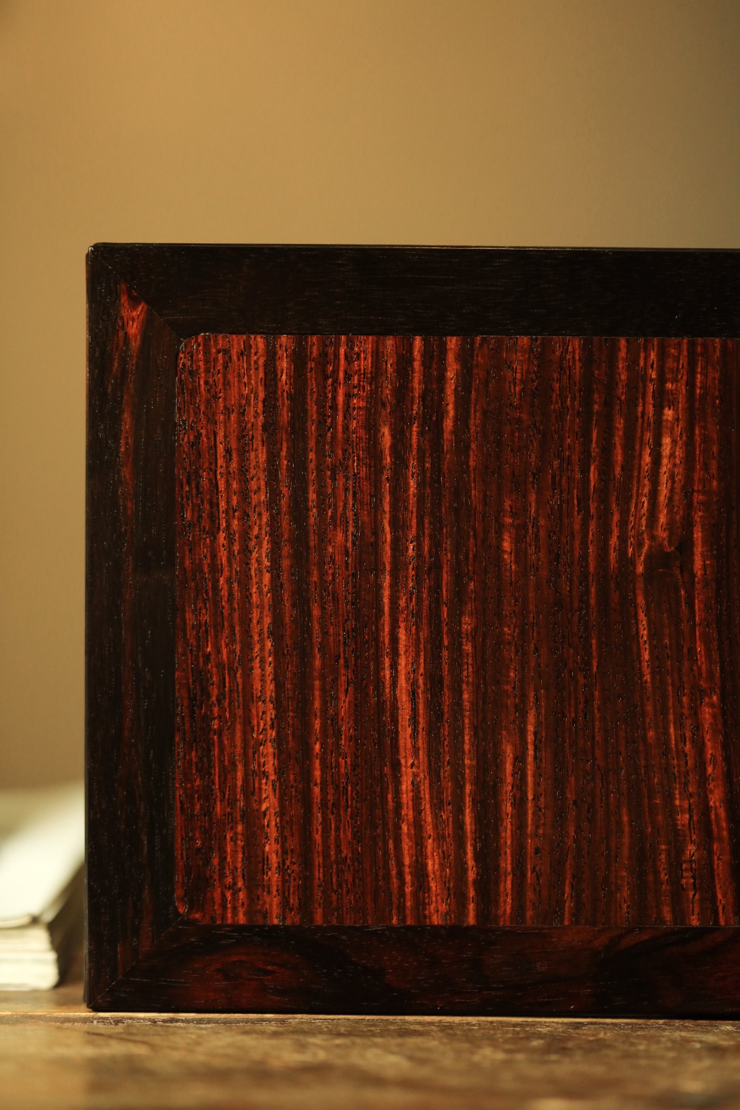 小几以大红酸枝制,几面大边以榫卯相交,四腿装饰拐子龙纹牙角,增加稳固性。下设罗锅形托泥与四足相交。制作考究。此小几应为桌上置物之用。