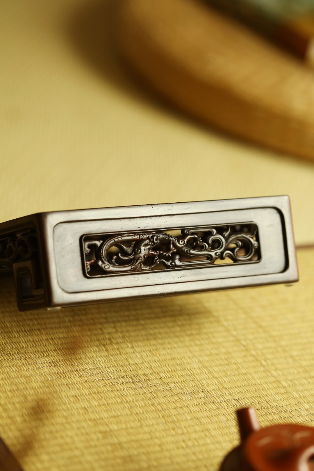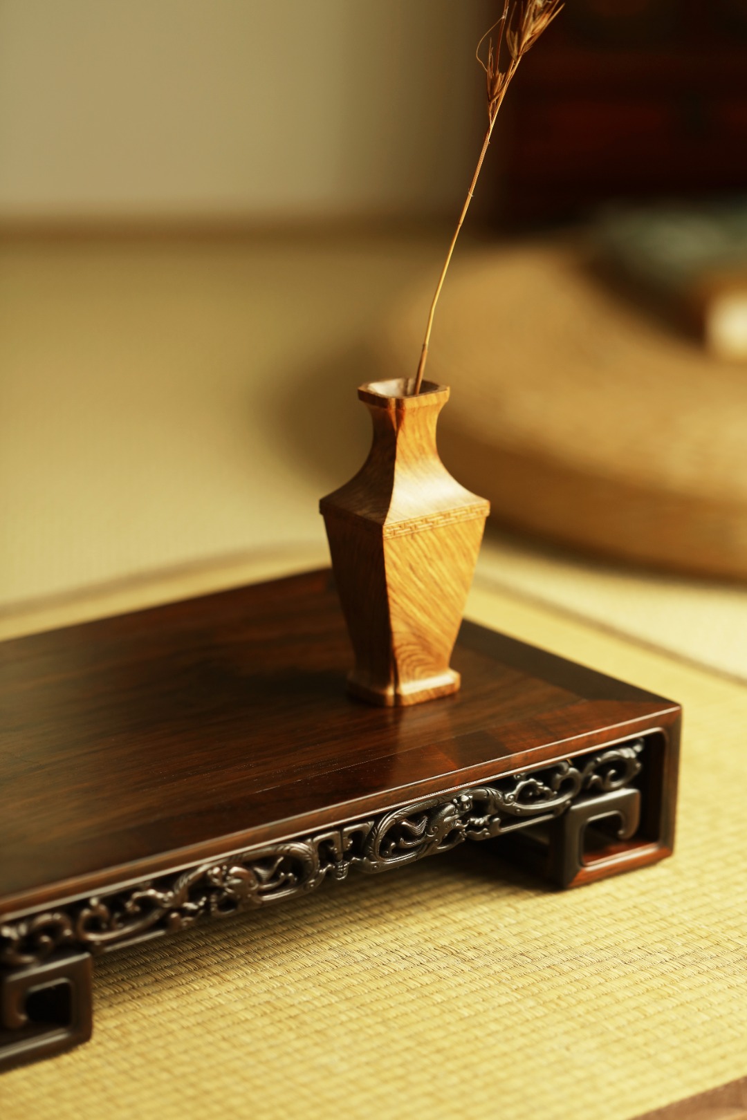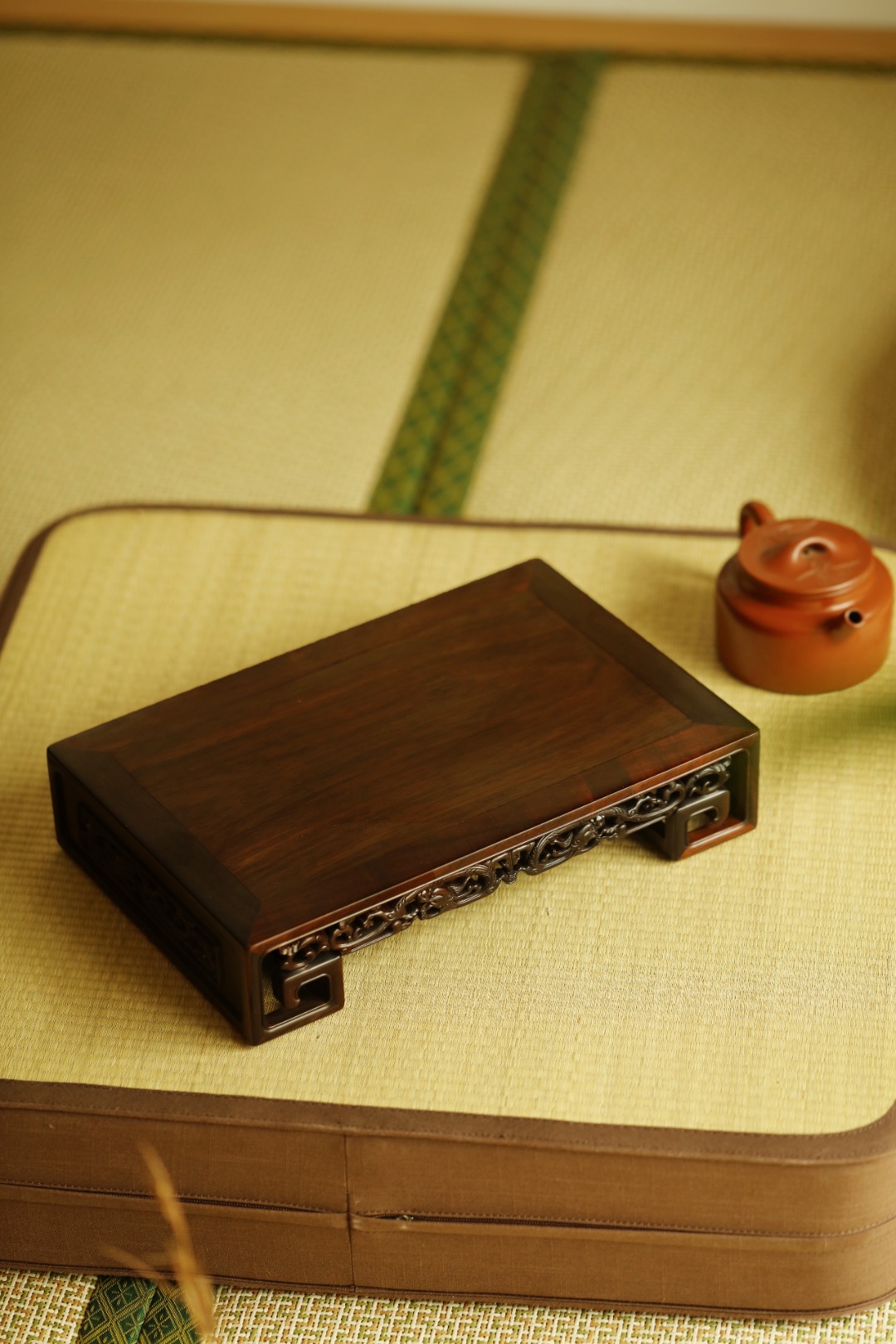 酸枝高密老料制,全榫卯结构,几面独板,边呈螭龙纹结构,质地油润,器型简洁优雅,承置清玩珍卉,香器、文雅有韵。