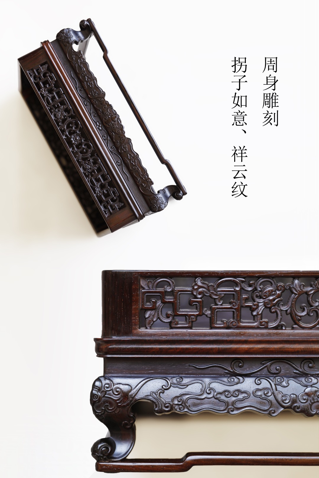 大红酸枝为材,周身雕刻拐子如意、祥云纹,线条劲挺,可承置清玩雅物,辅文房、茶事、香事,实用美物。