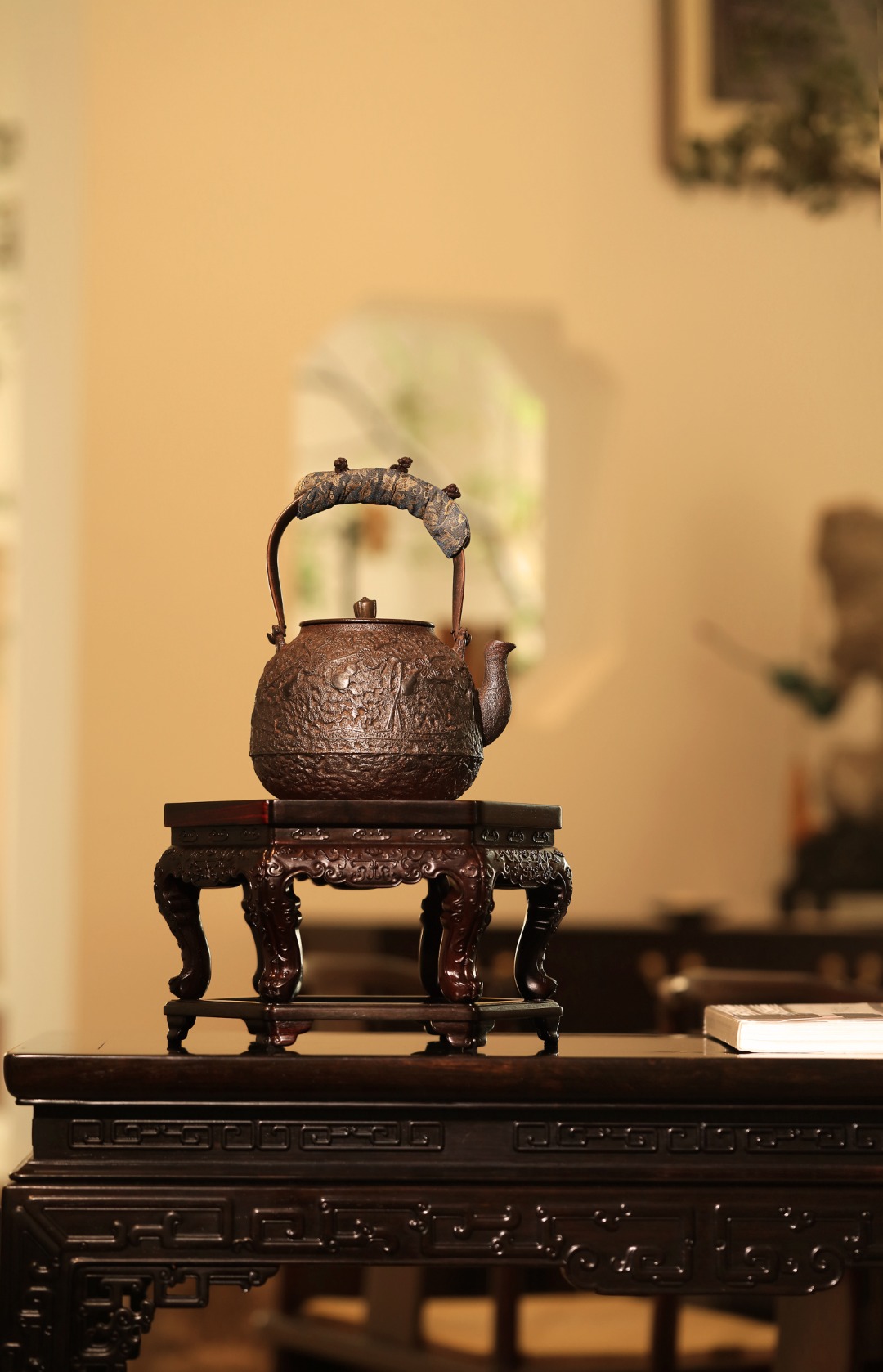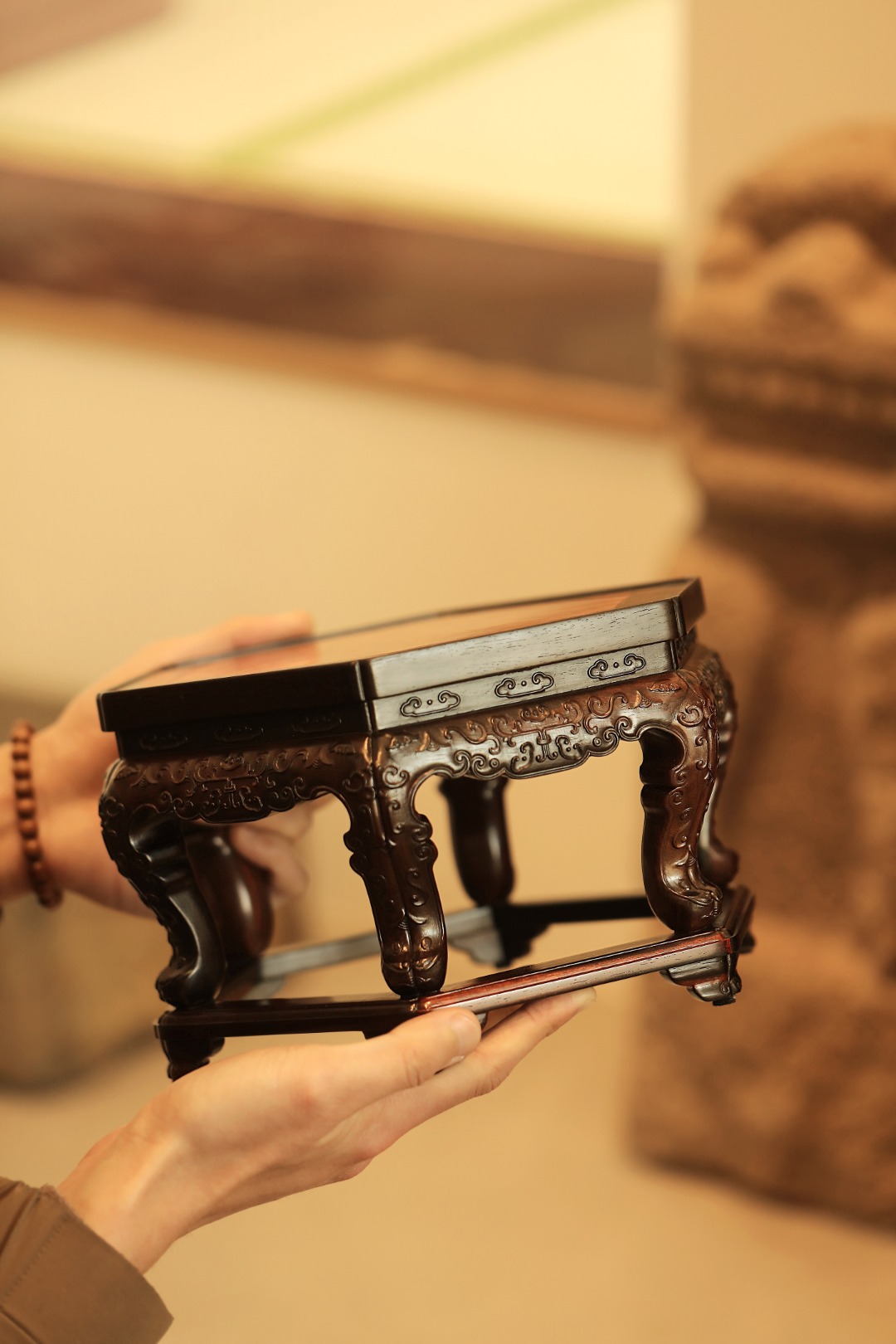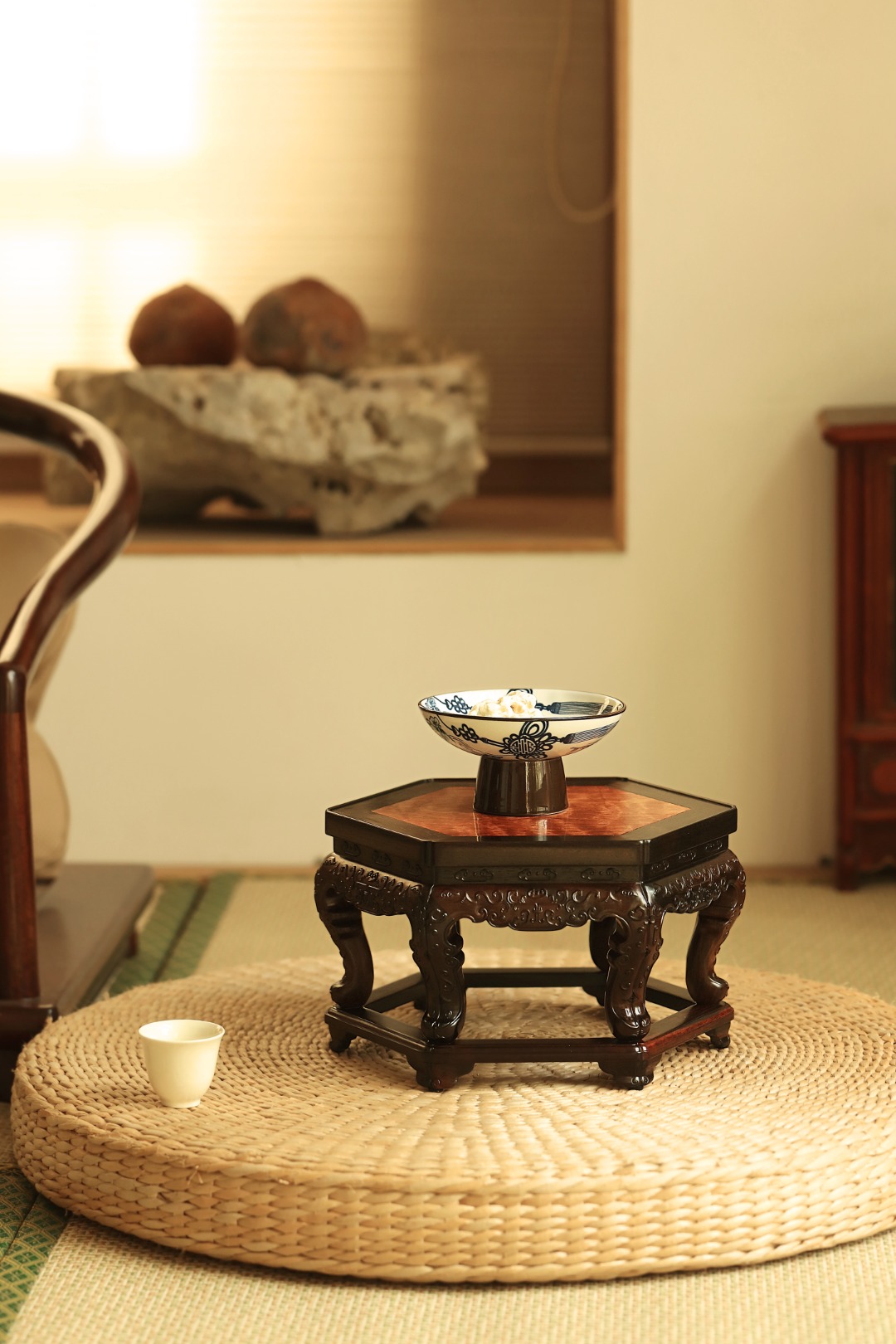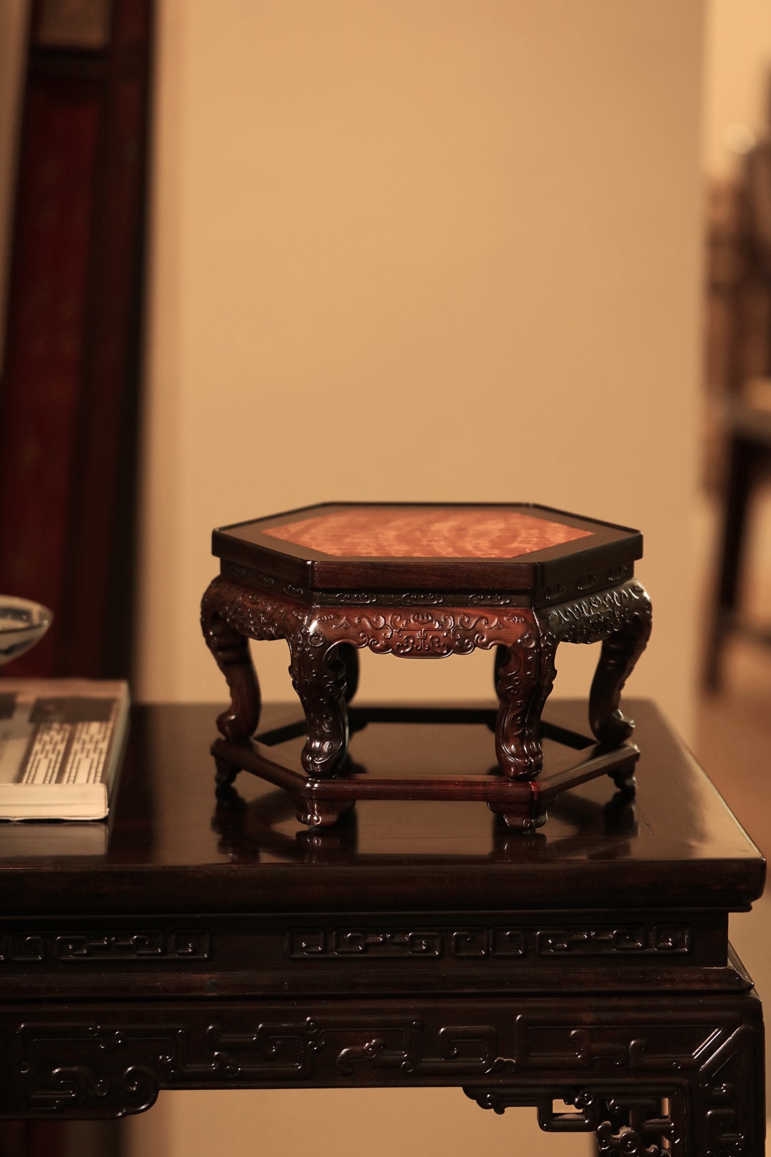 案上雅器,全榫卯结构,六足满雕如意纹,面嵌缅花,细节精制考究,载古托珍,颇增古韵,材质温润,触感细腻,无论是陈放古玩珍宝,还是作为摆件独赏,皆能彰显非凡品味。