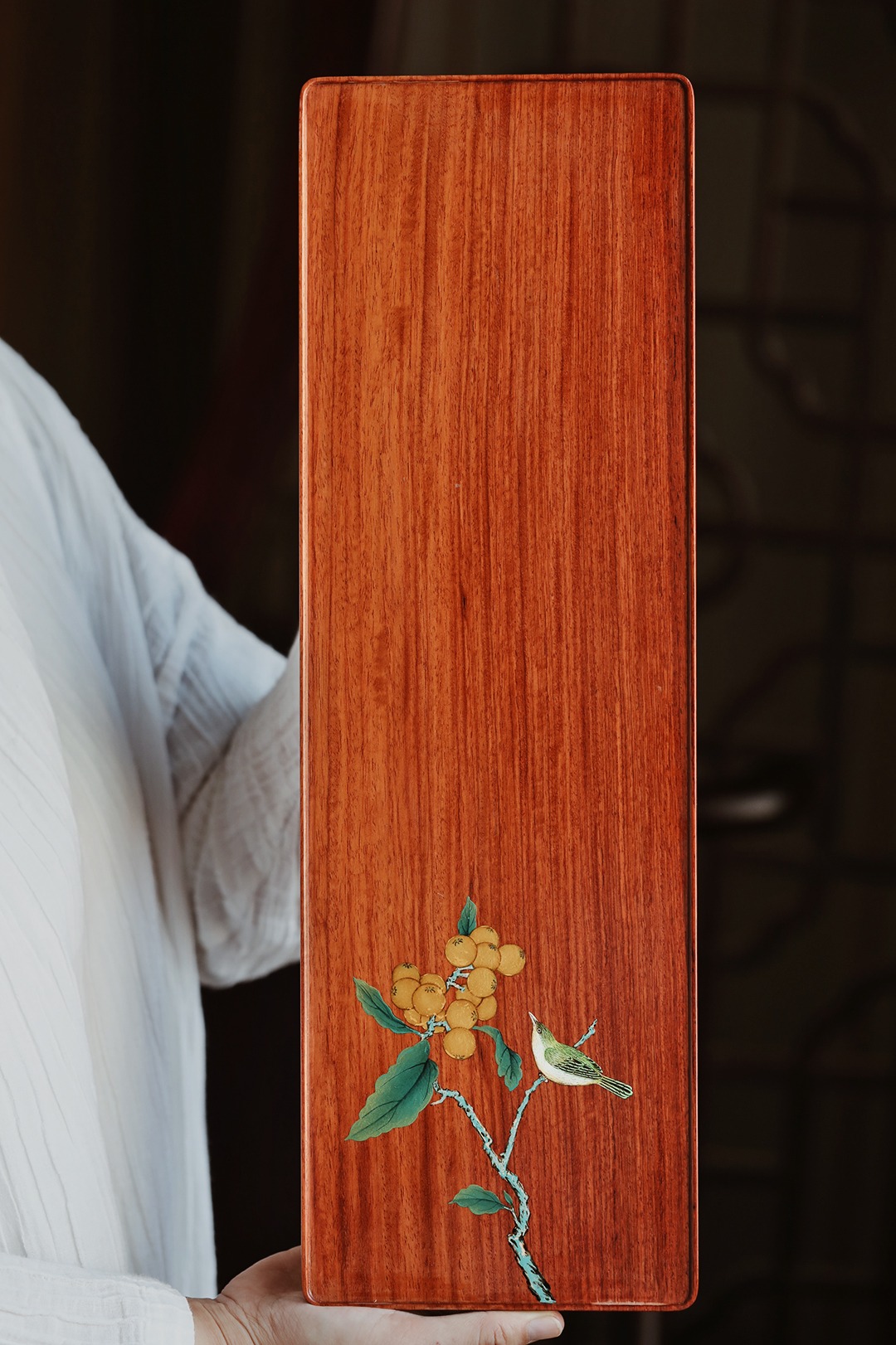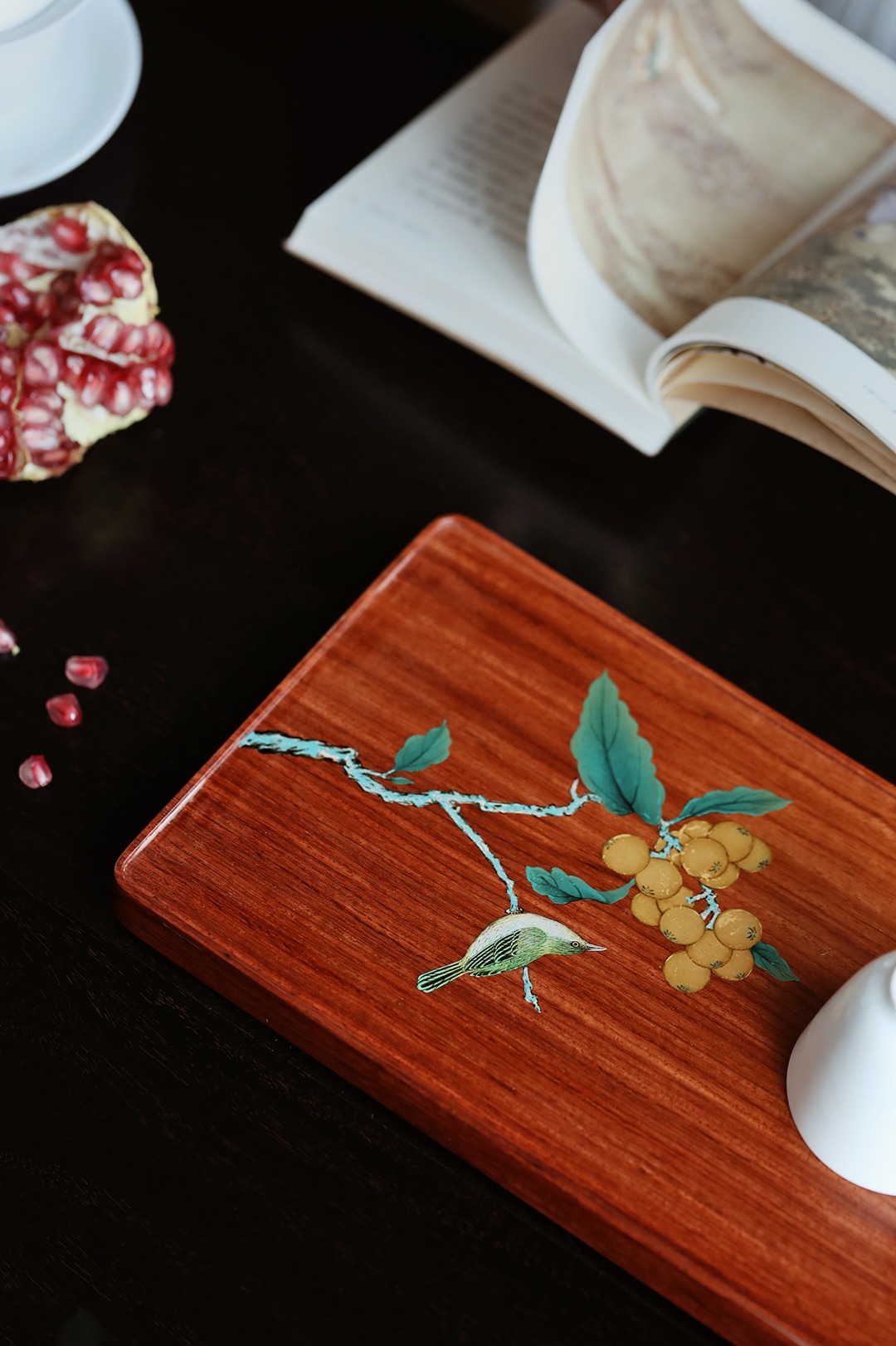 盘面漆绘山鹊图,描画工致细腻,