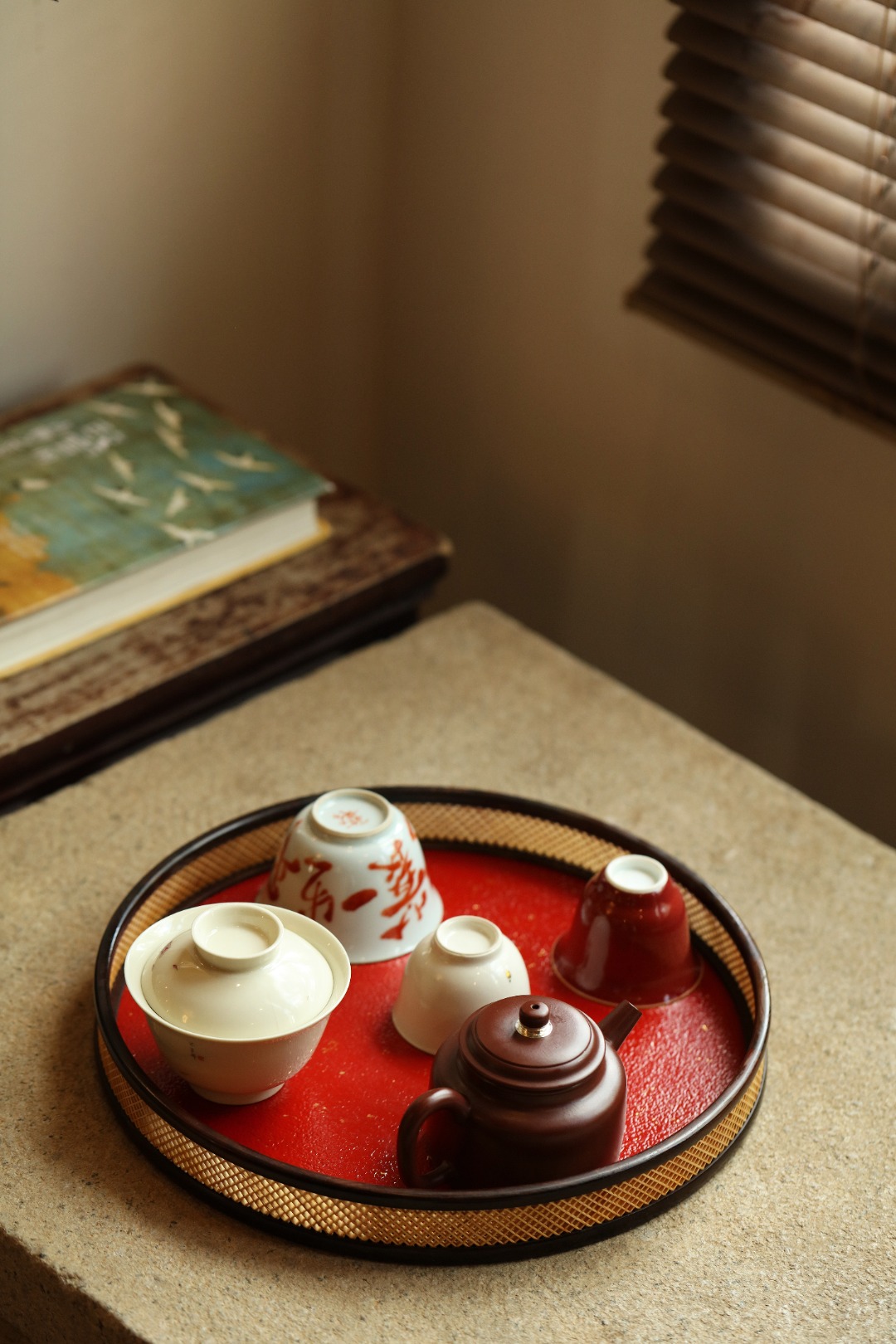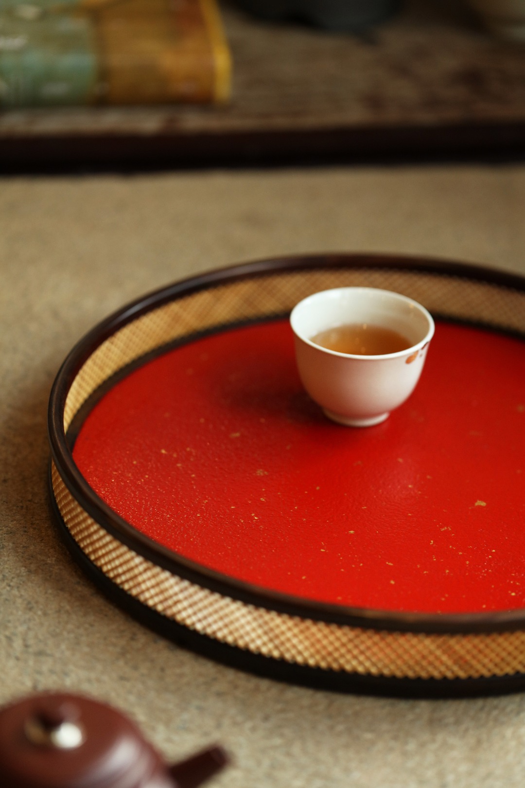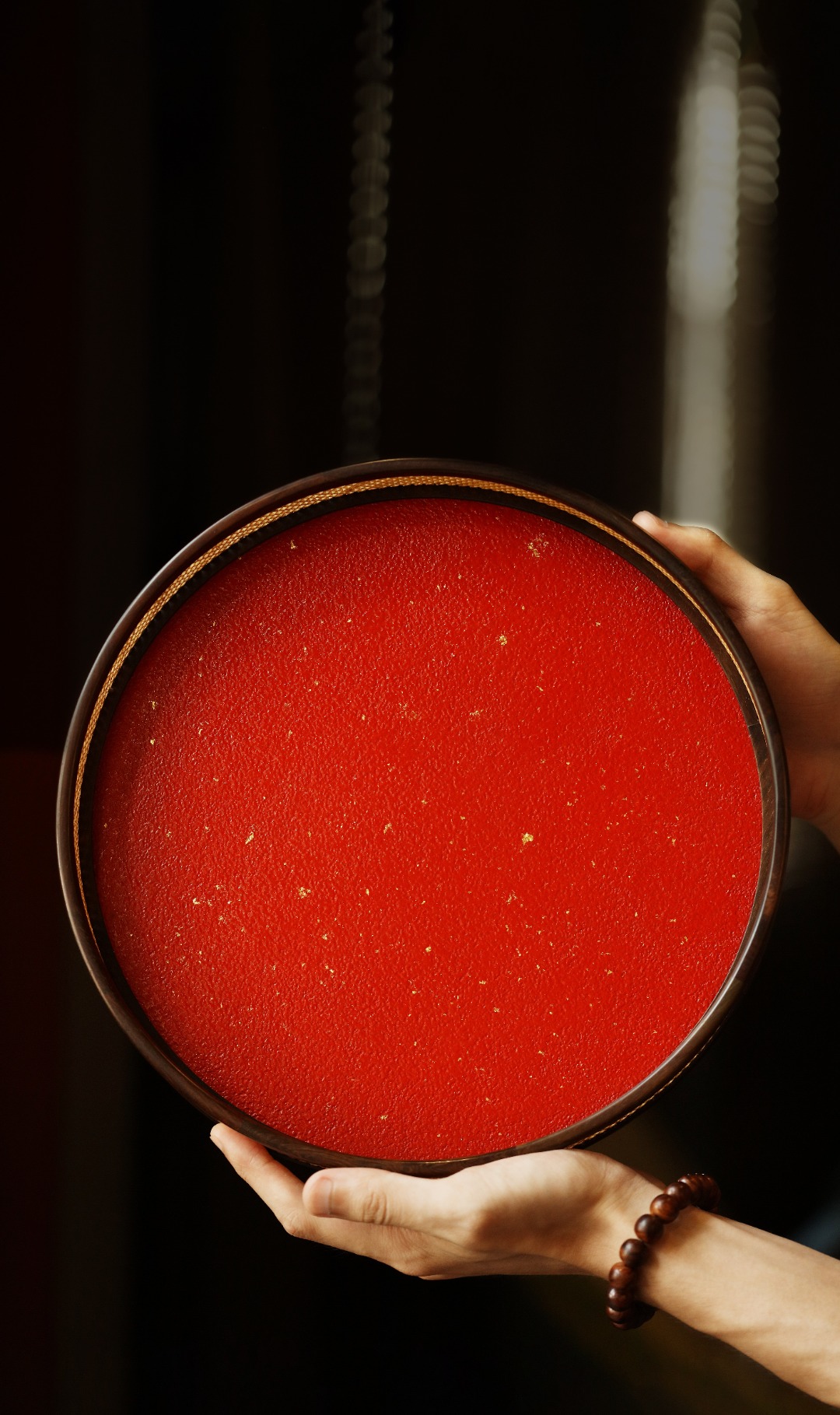 盘心粗麻裱布,后髹饰大漆数层,金箔点缀,具中式韵味,壁膛全榫卯黄杨木菱字拼,0.5mm极致工艺标准,形意圆圆满满,一物多用,宜书案茶桌收纳,雅室茶几摆放水果,干果,零食、满目清雅。