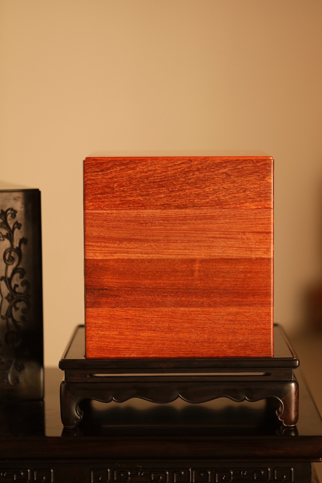 紫光檀外框四面葵形镂空,四面浮雕西番莲纹饰;里设缅花多层格,收纳容量大;果子器,茶点小事,收纳置物,文房茶室百搭,极具生活格调。