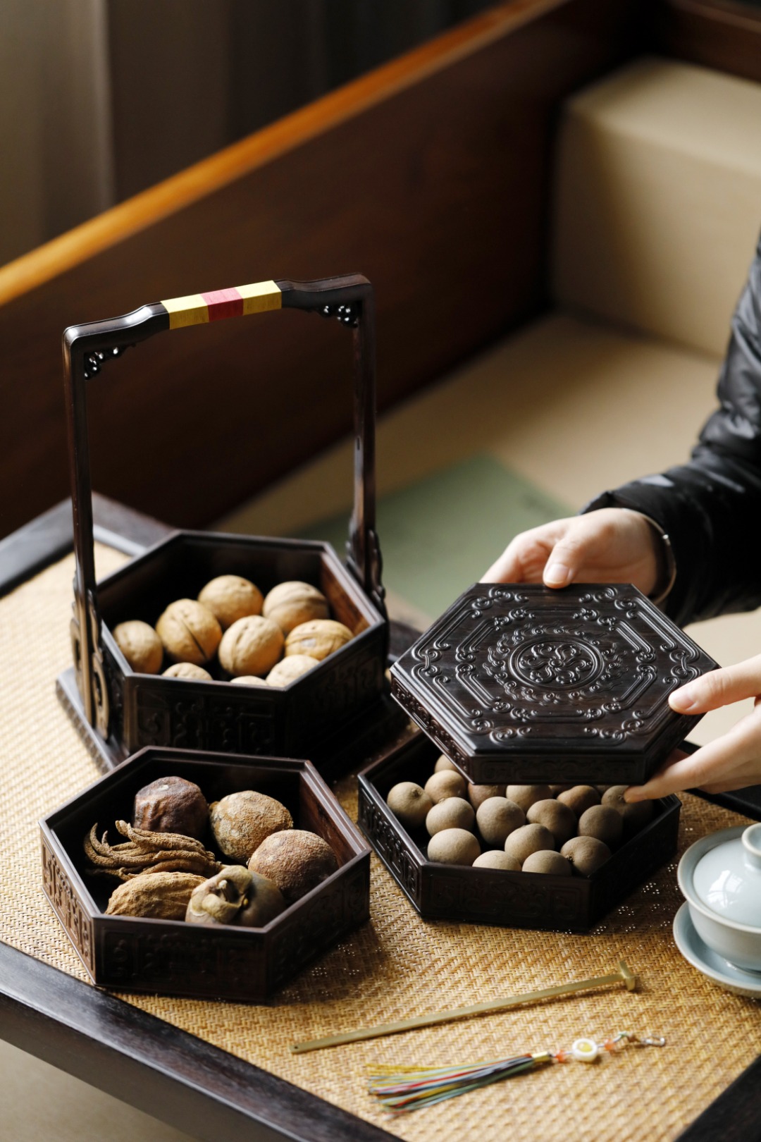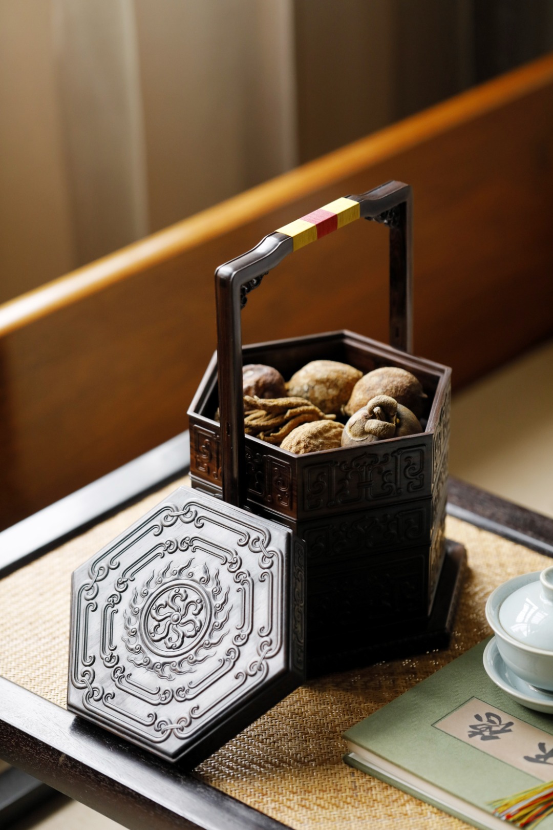 六边倭角式,盖与身子母口相合;