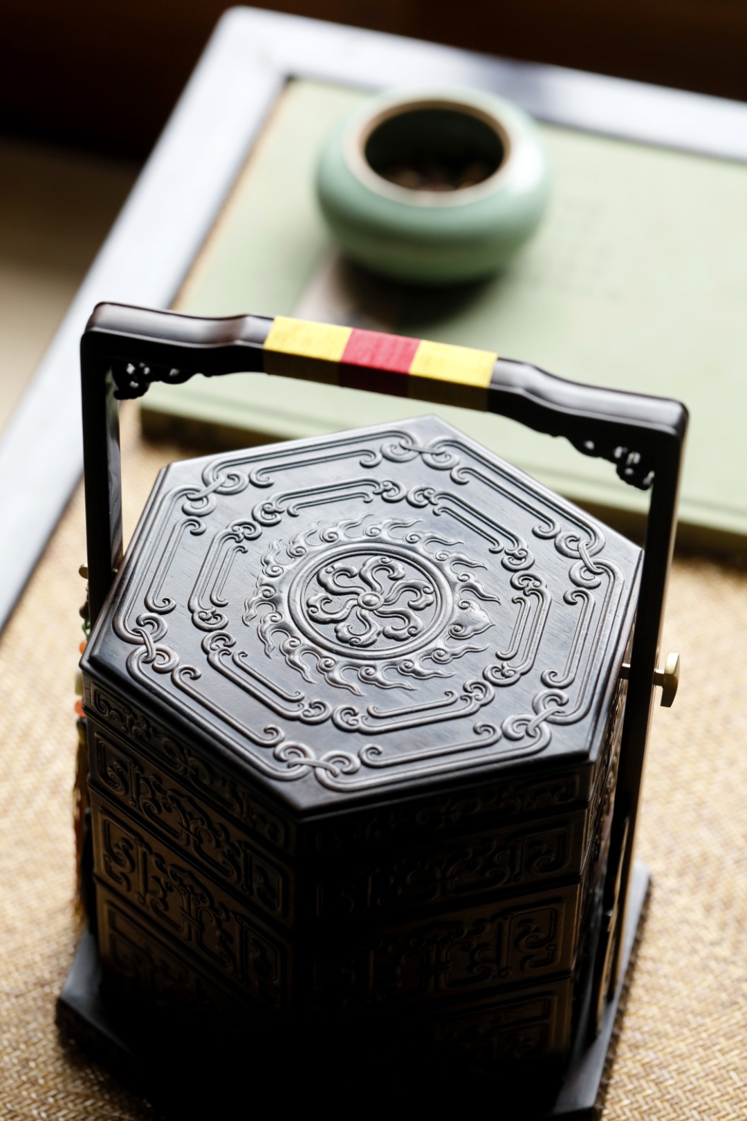 周围饰如意锦纹,寓意吉祥如意之意;