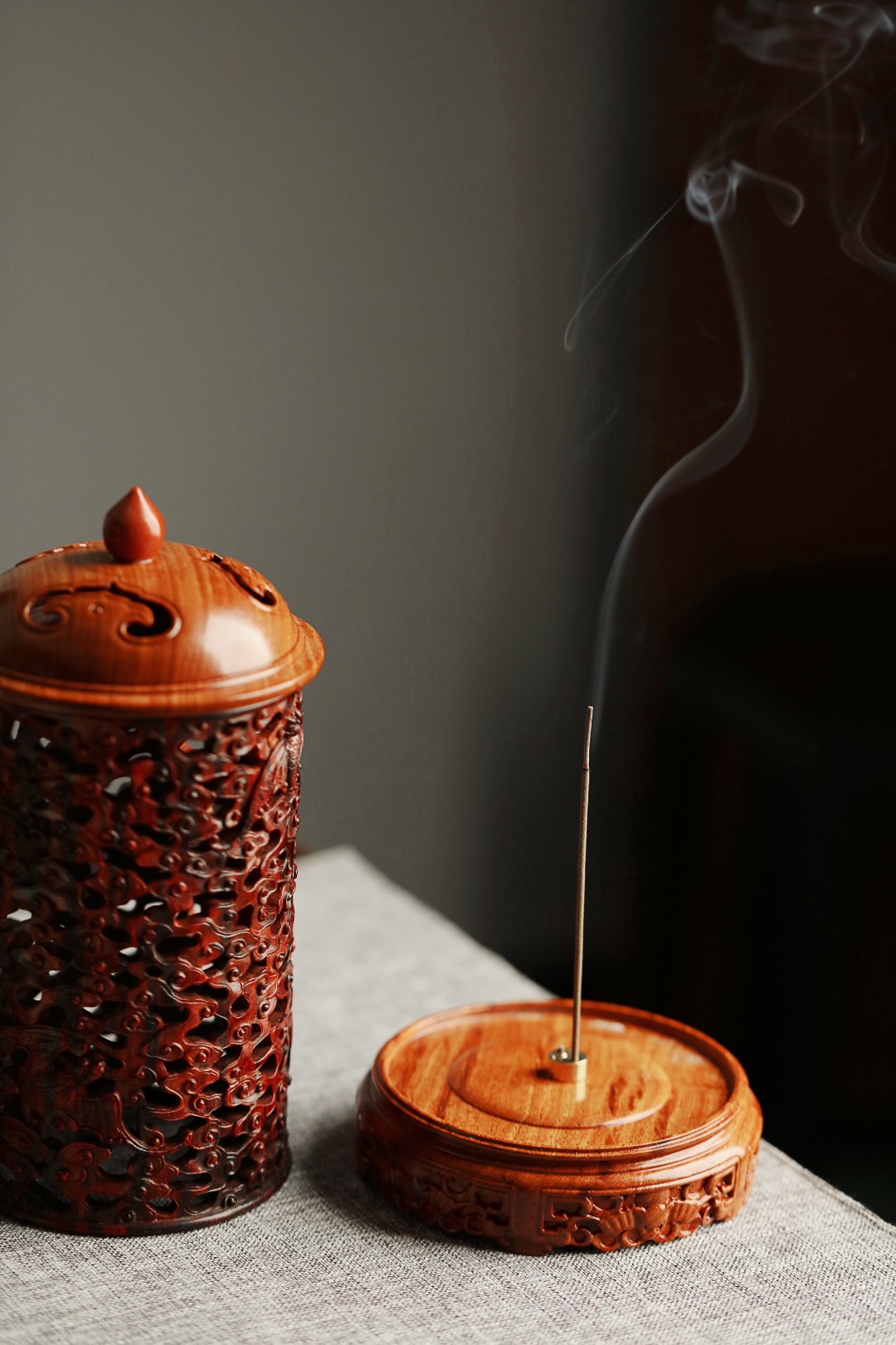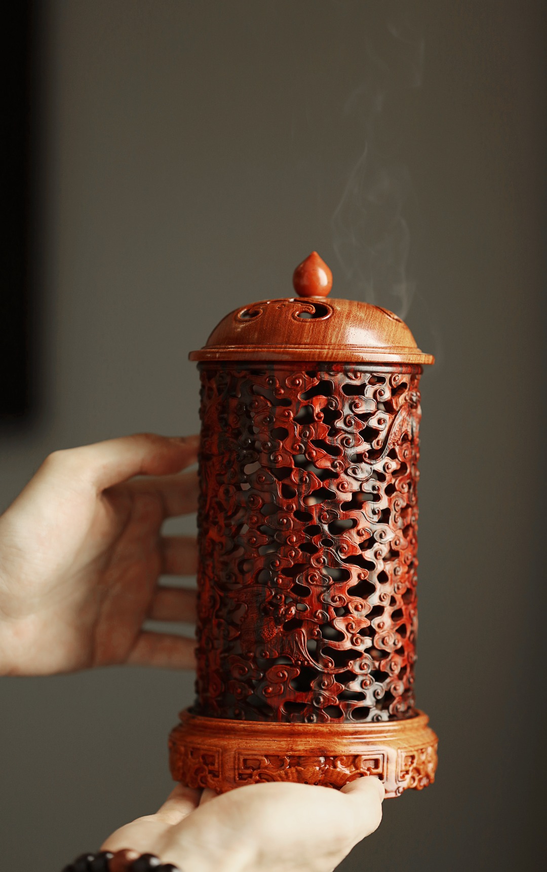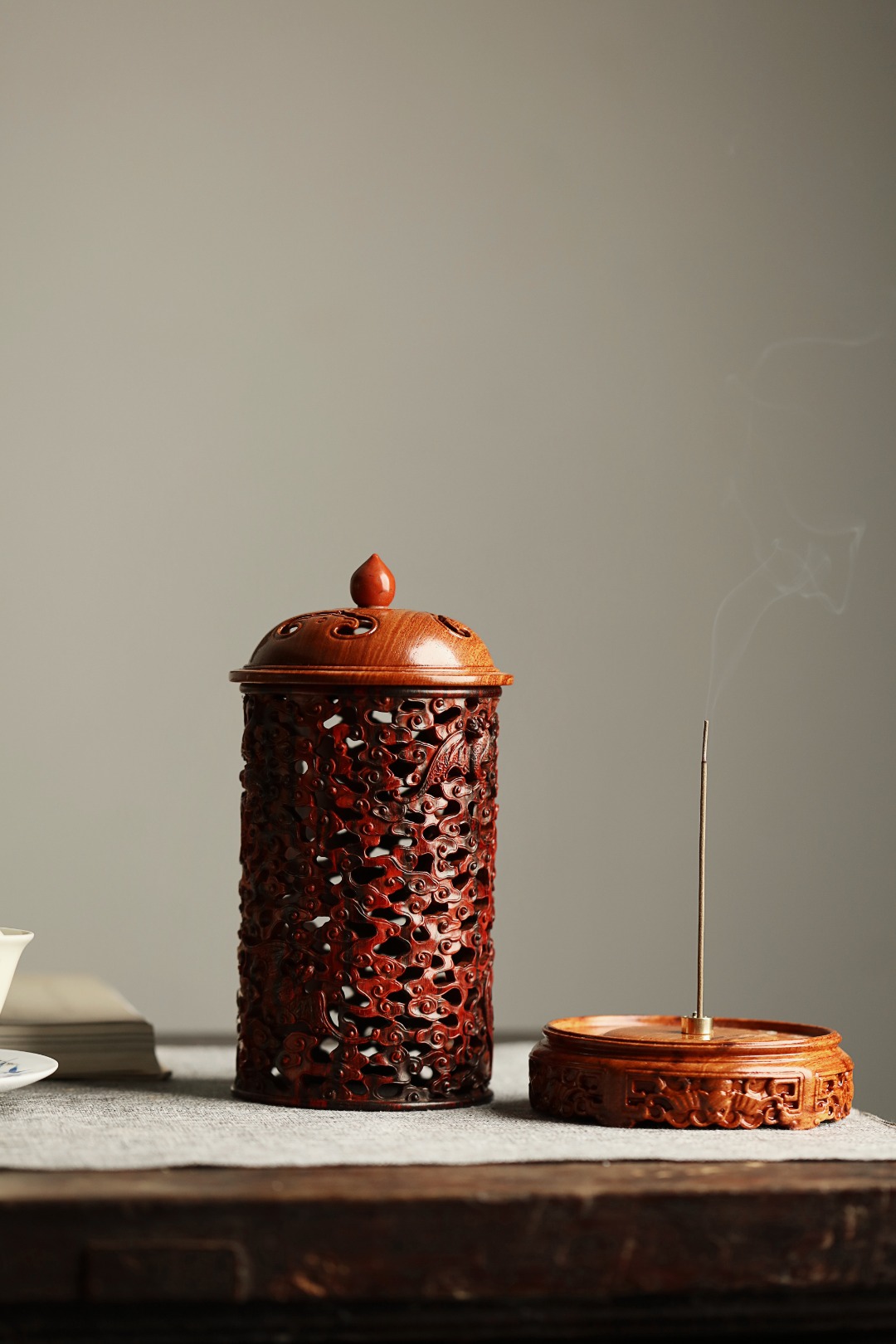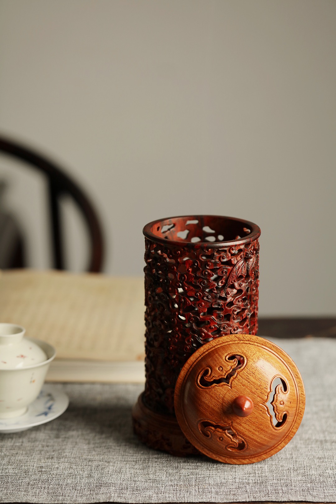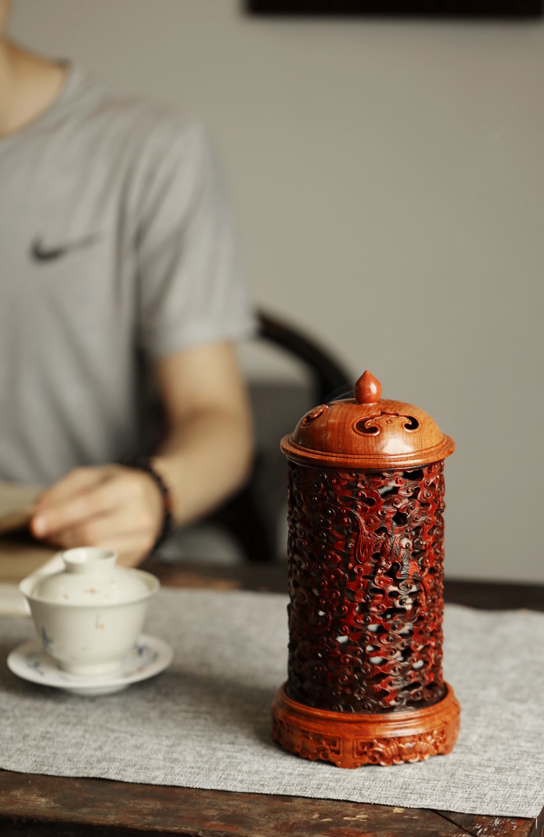 满工透雕,运刀似笔走龙蛇,祥云缭绕,瑞蝠环飞,工品繁而不俗,具宫廷气度。上下盖为缅甸花梨,撞色设计,入厅堂案几,清贵祥和。