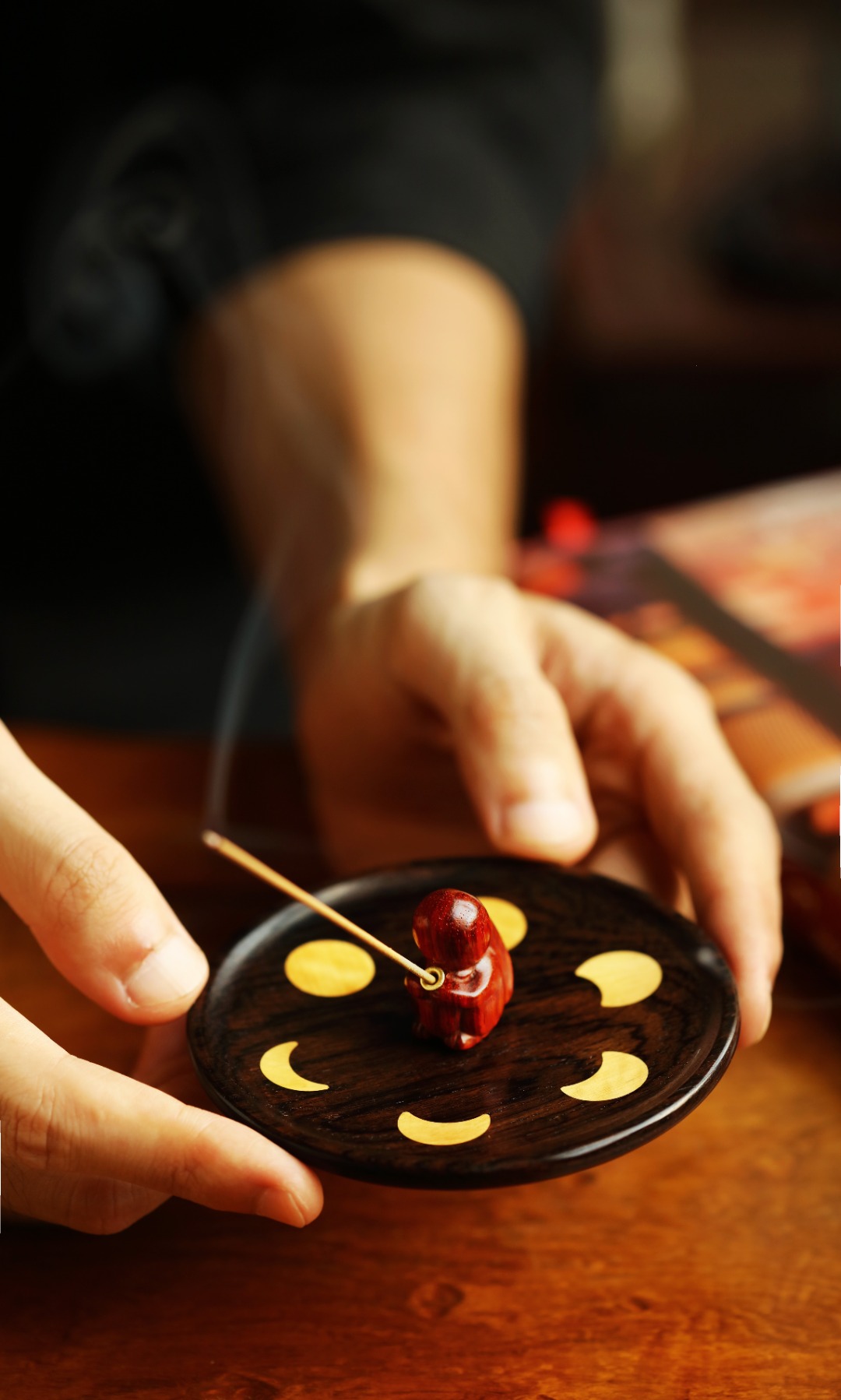 小叶紫檀玉兔,底座紫光檀镶嵌黄杨木,以月食为题材。玉兔举