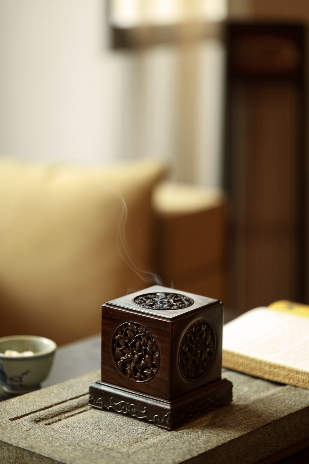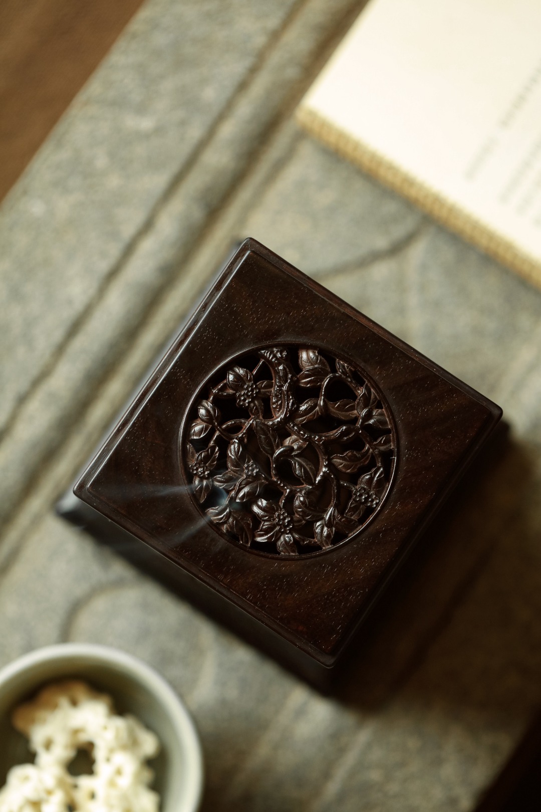 酸枝黑红老料制,经典手作,榫卯精工,镂空雕刻玉堂花纹,面面玲珑可观。文房案头,焚香出烟莫测,更添品赏云霞之趣。