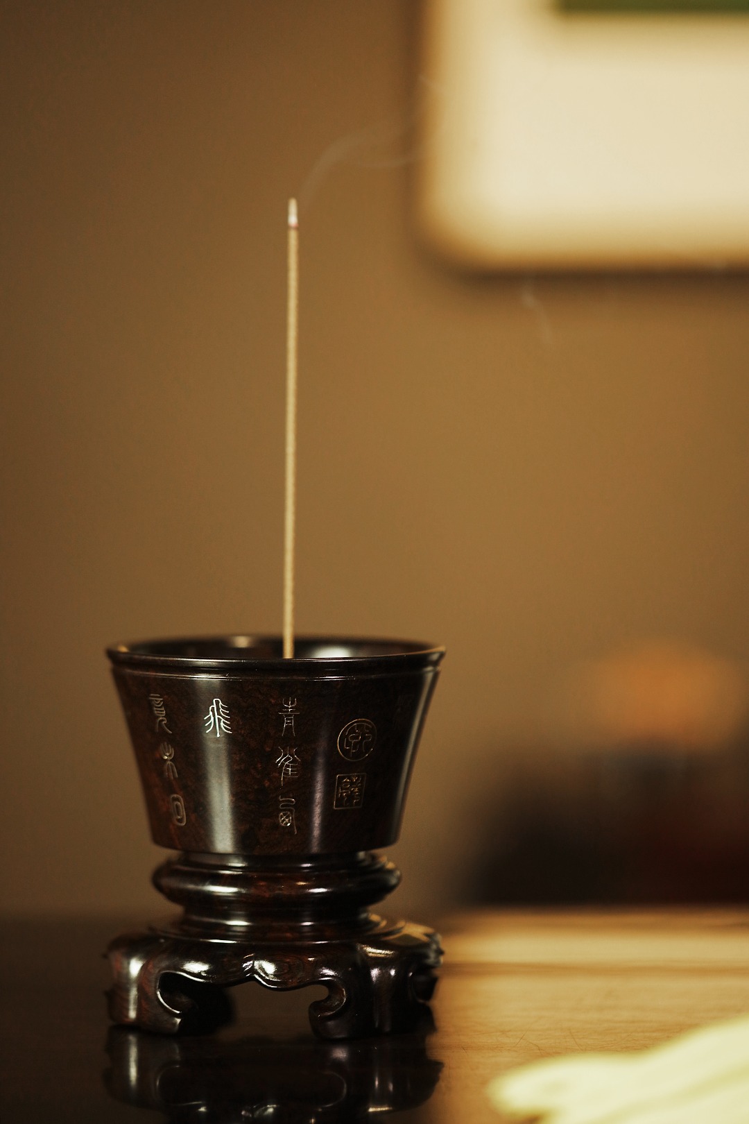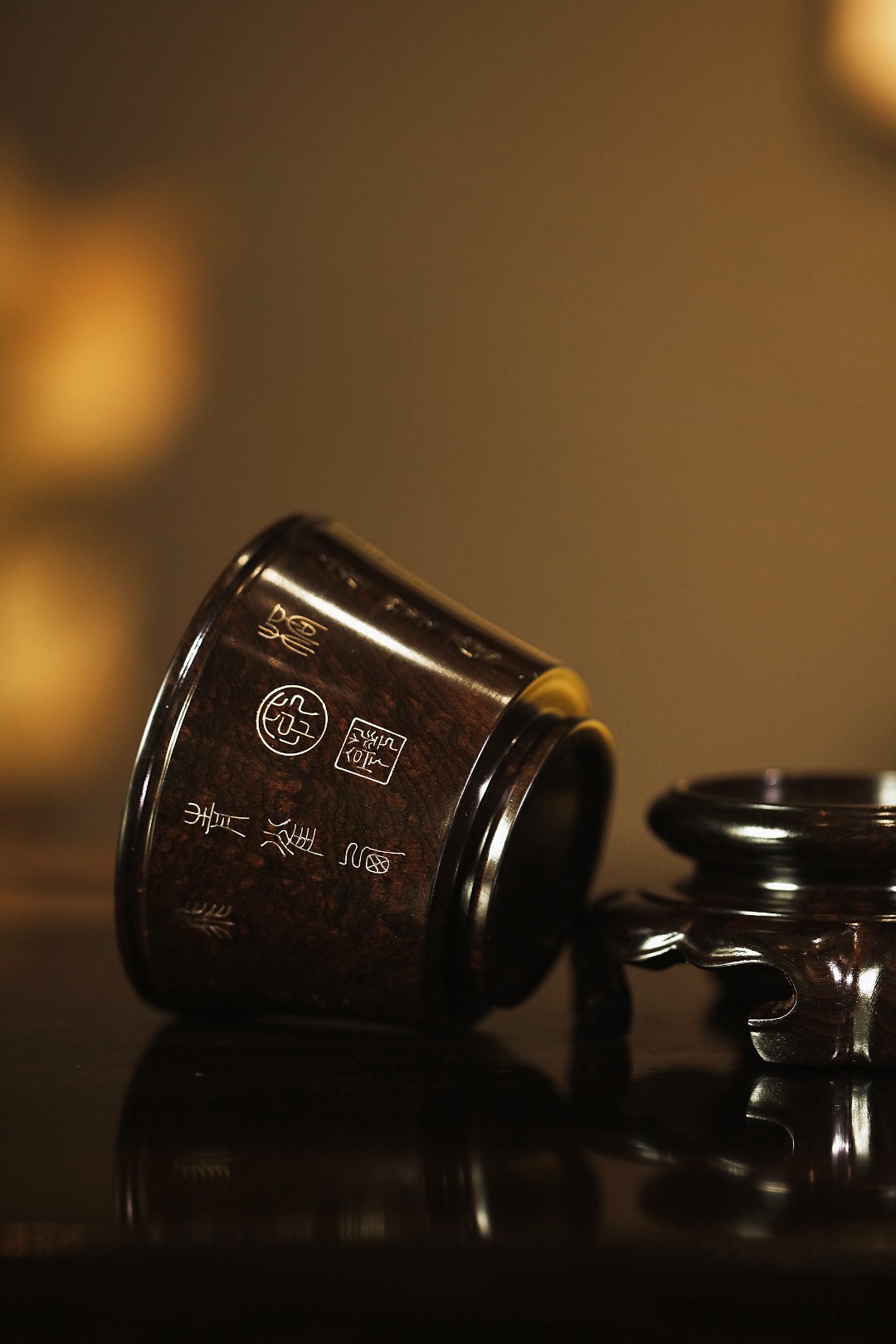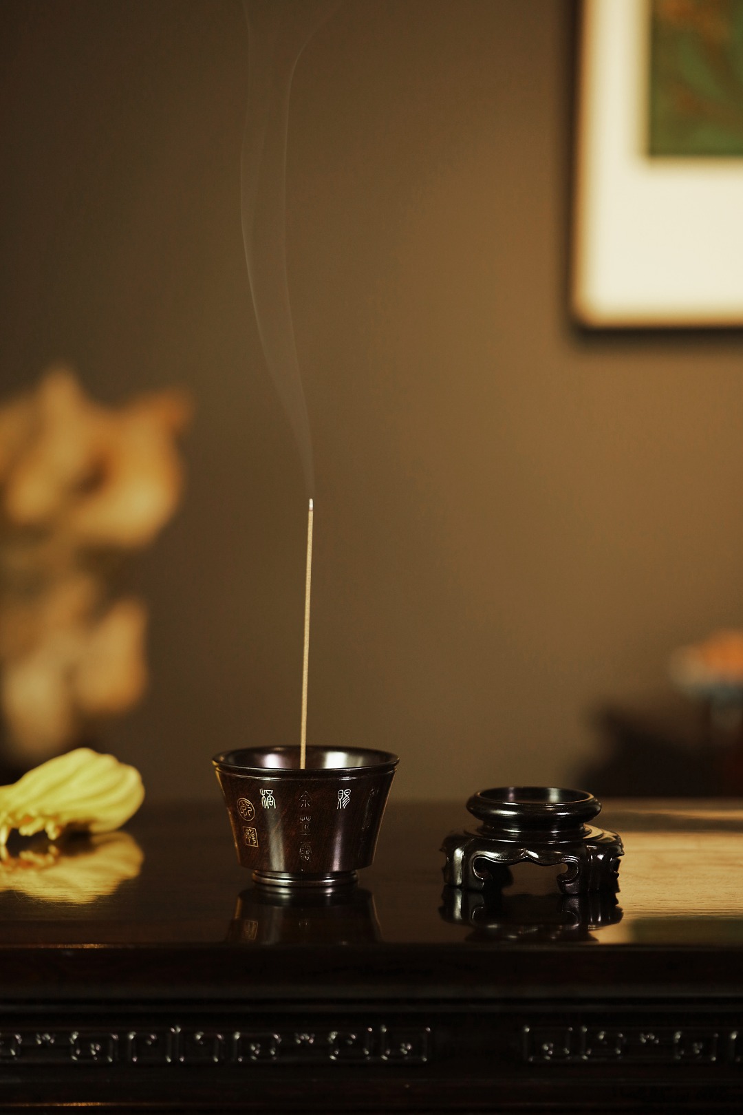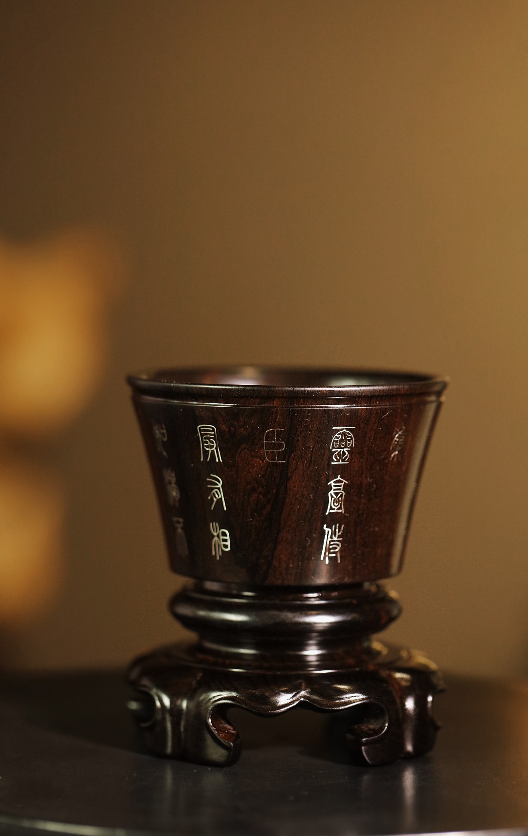 取材紫光檀精品料,上部外壁以嵌银丝工艺饰篆书诗文“青雀西飞竟未回,君王长在集灵台。侍臣最有相如渴,不赐金茎露一杯。”下部四足底座,型似战国杯,陈置案几燃香,文雅精致!