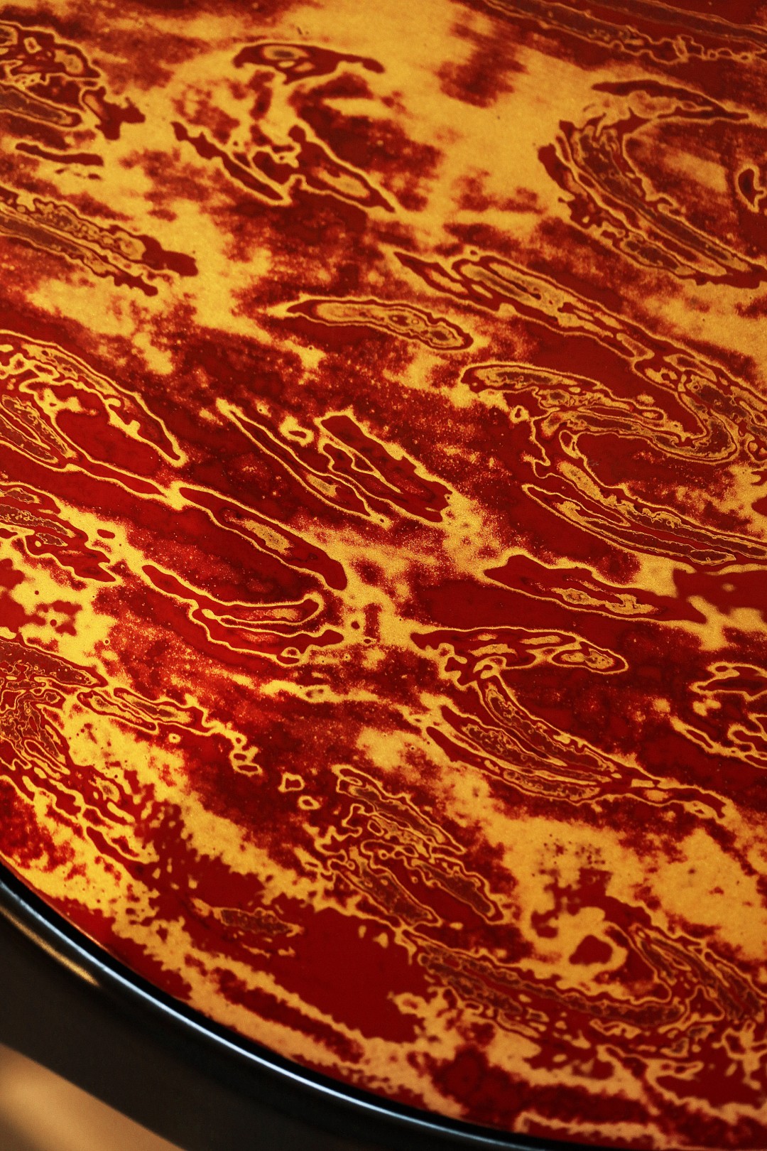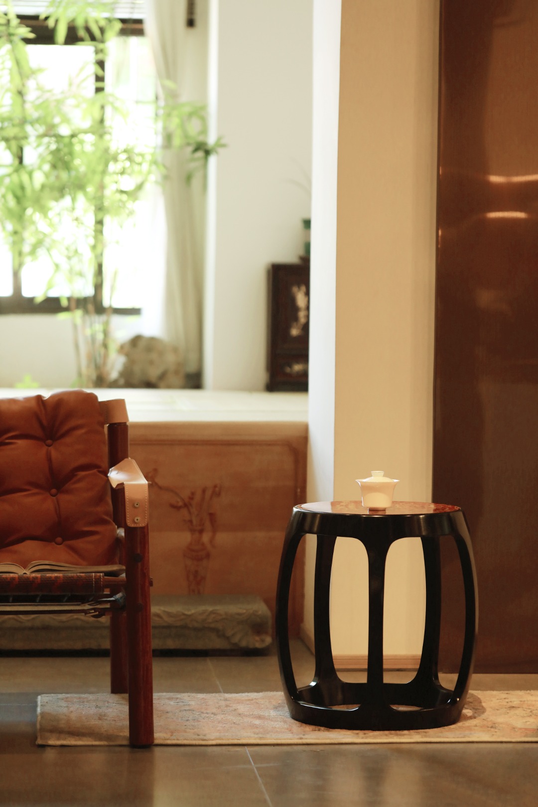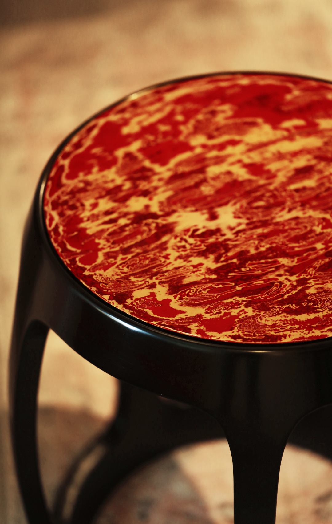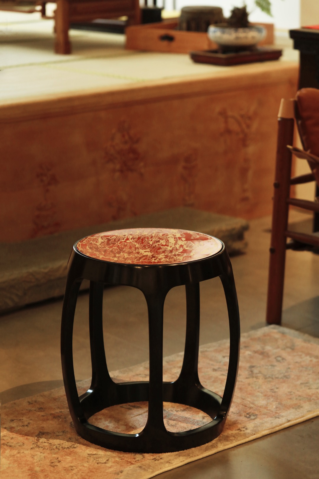 宫廷鼓凳,五足插肩榫结构,足下有托泥,全身光素。面心大漆非遗工艺,富贵华丽,是为画龙点睛之笔。