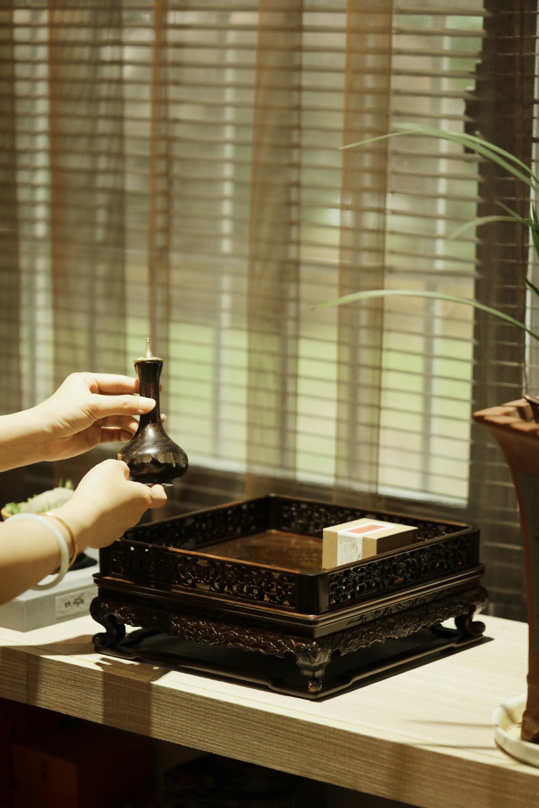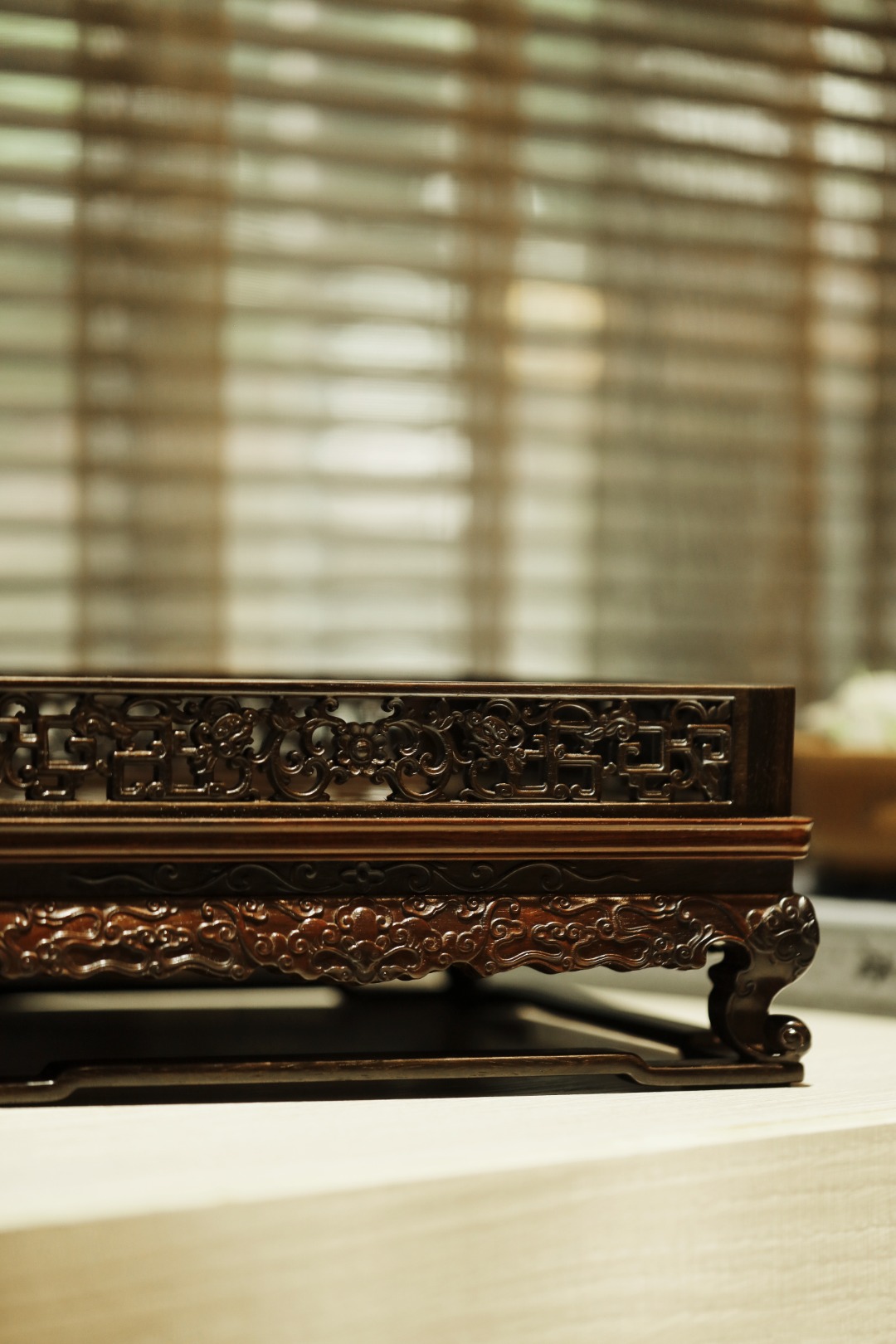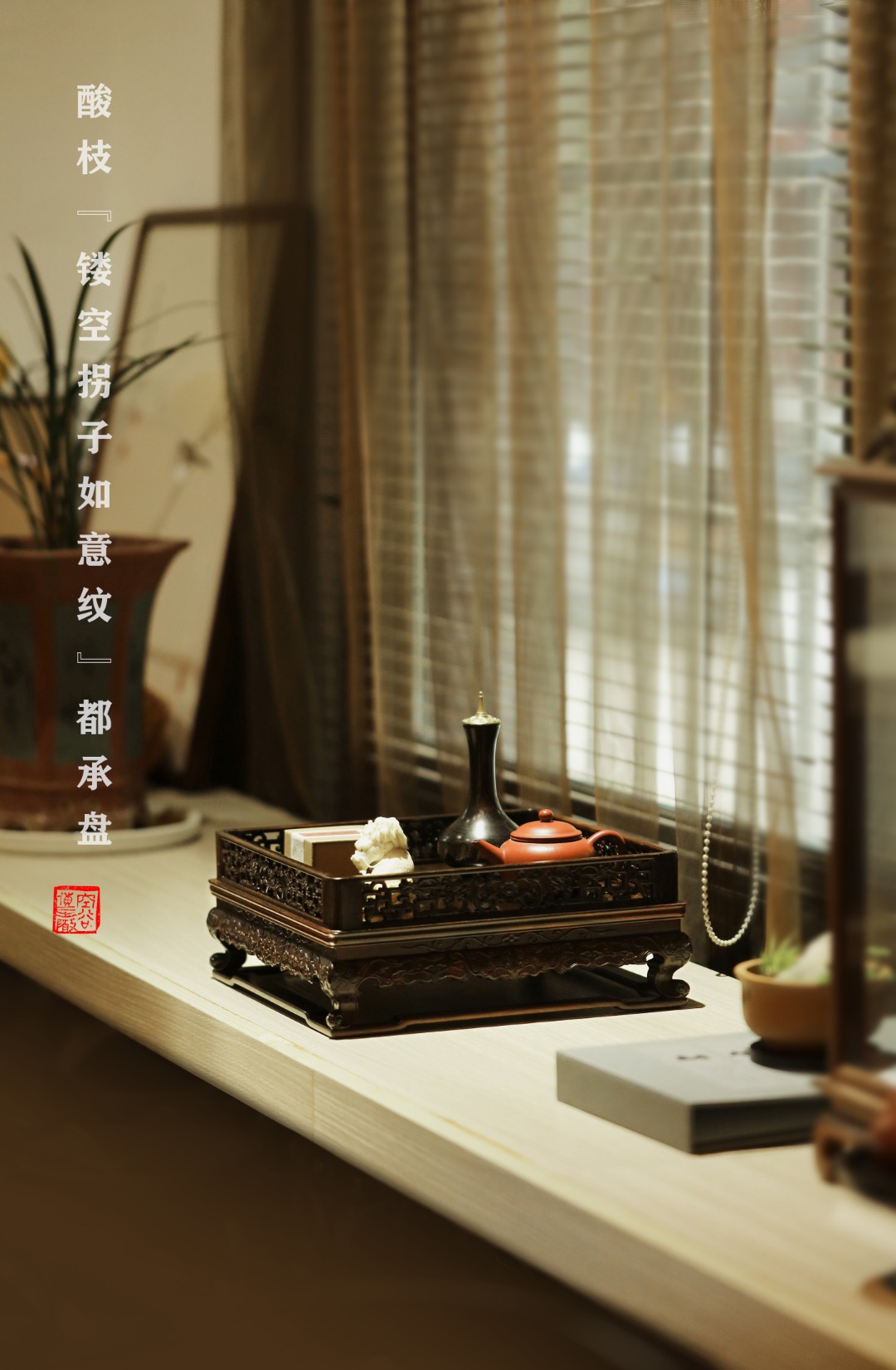 大红酸枝为材,周身雕刻拐子如意、祥云纹,线条劲挺,可承置清玩雅物,辅文房、茶事、香事,实用美物。