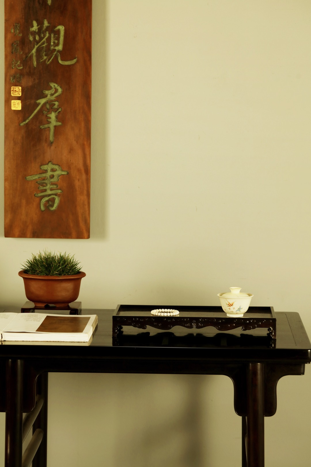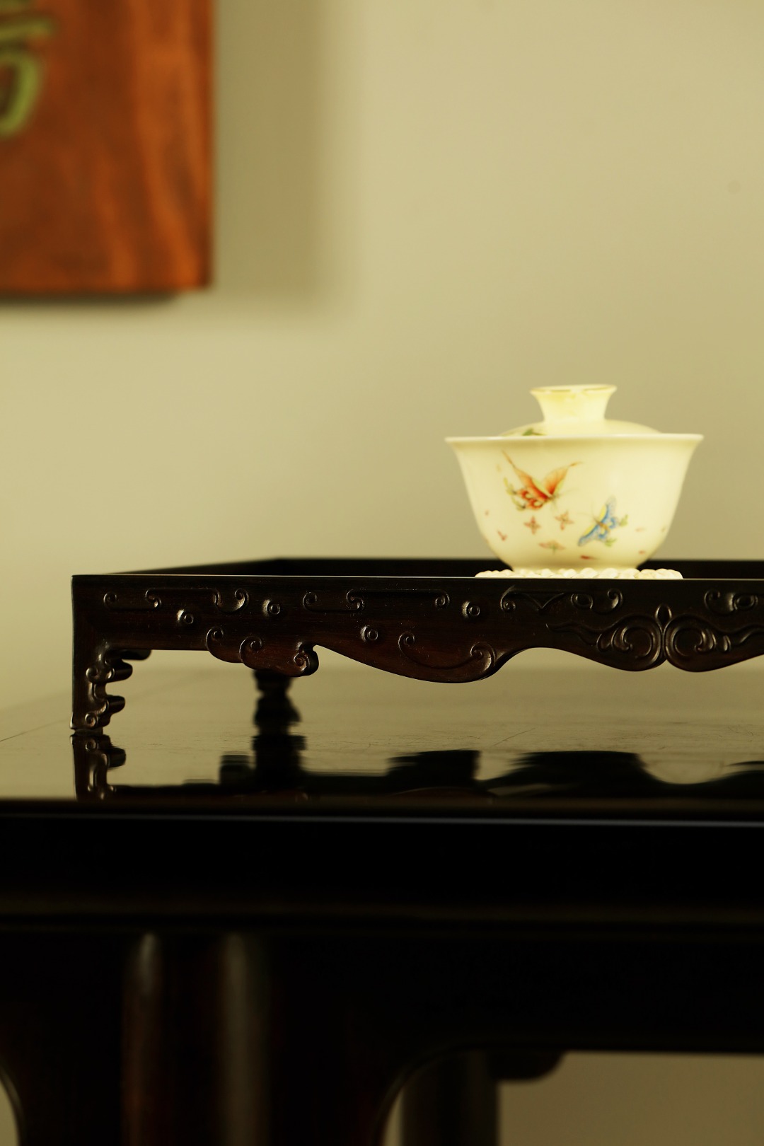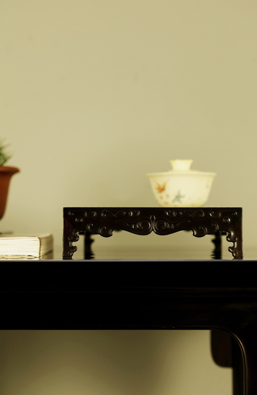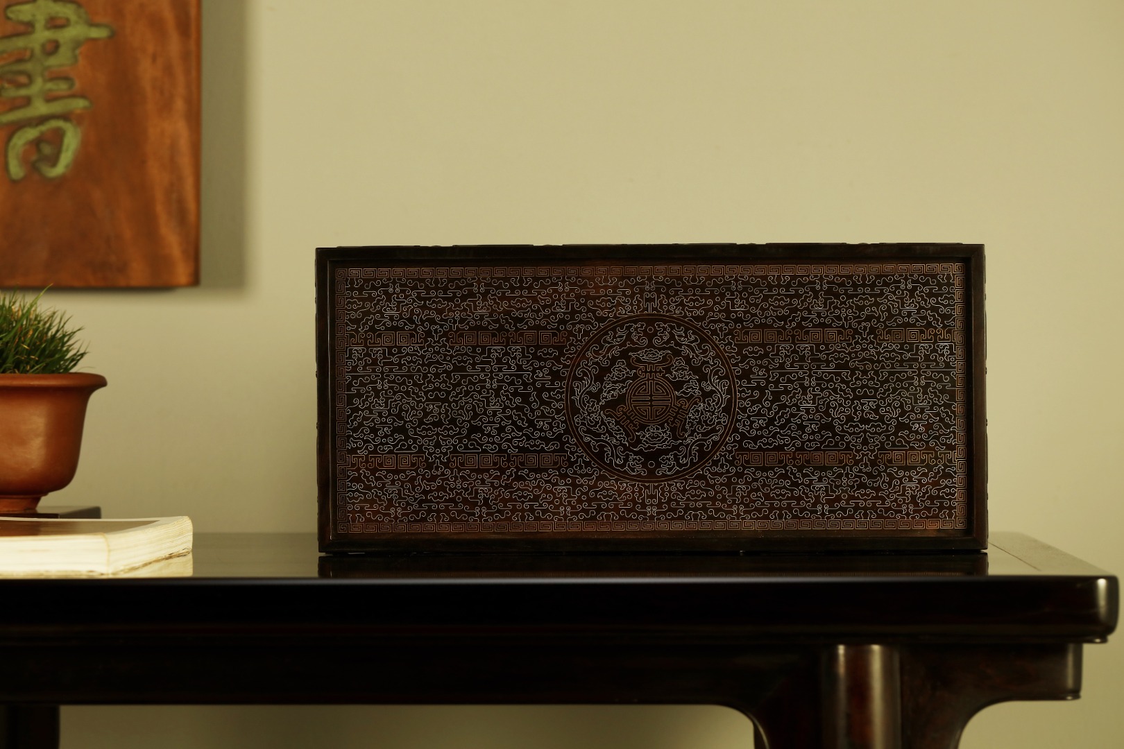 取材油润细腻,盘心手工镶嵌银丝做如意纹饰,四侧浅雕传统纹样,榫卯结构做工精湛,平整光洁,纹饰复古。置放桌案,温文尔雅,极具文气。