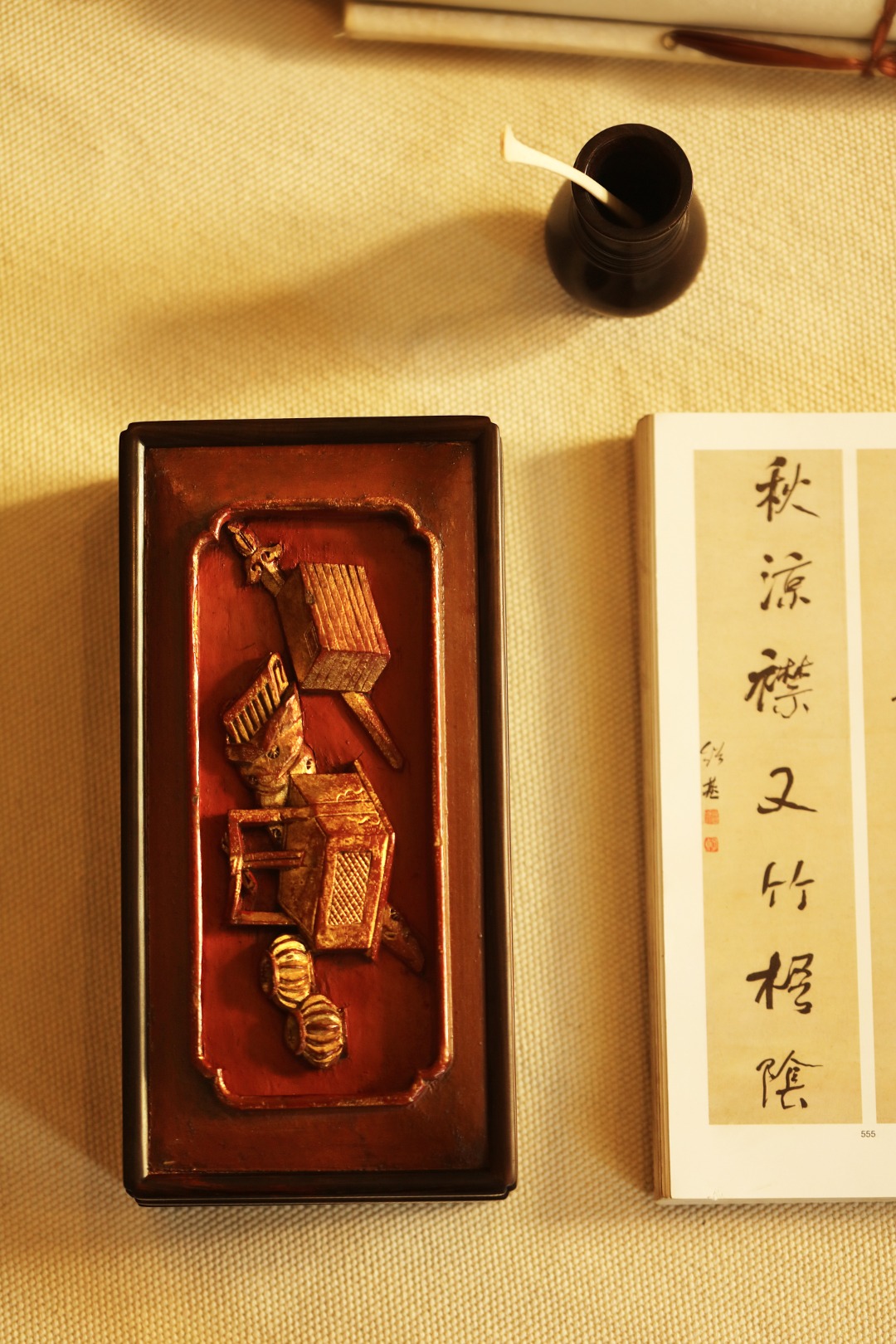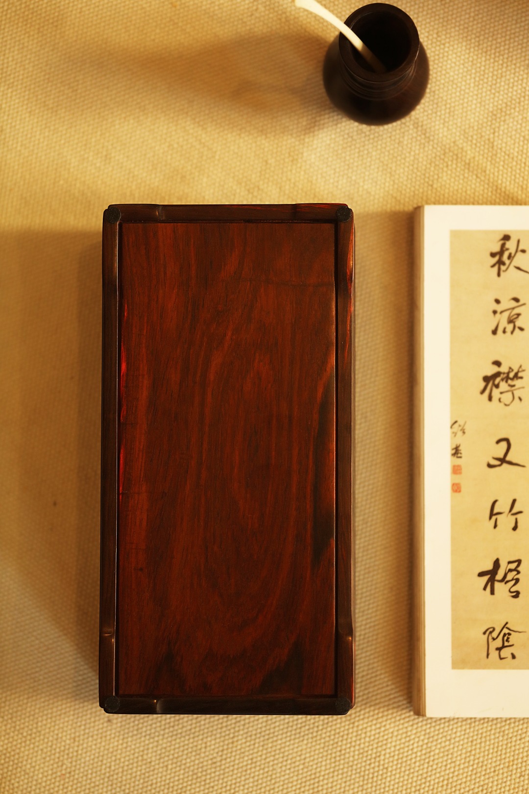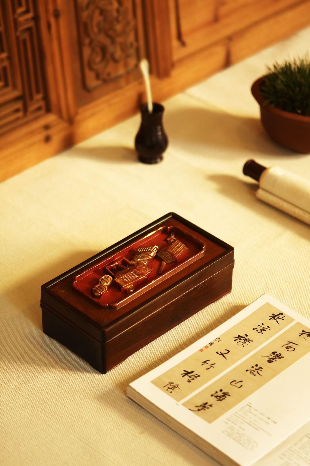 大红酸枝老料全独板制,面嵌清代花板,朱漆鎏金,古韵醇浓兼具清雅之气,文房案头收纳,自成一景。