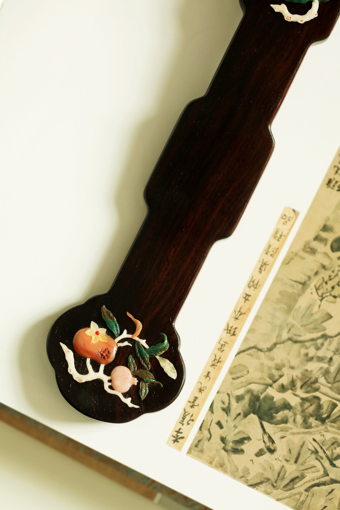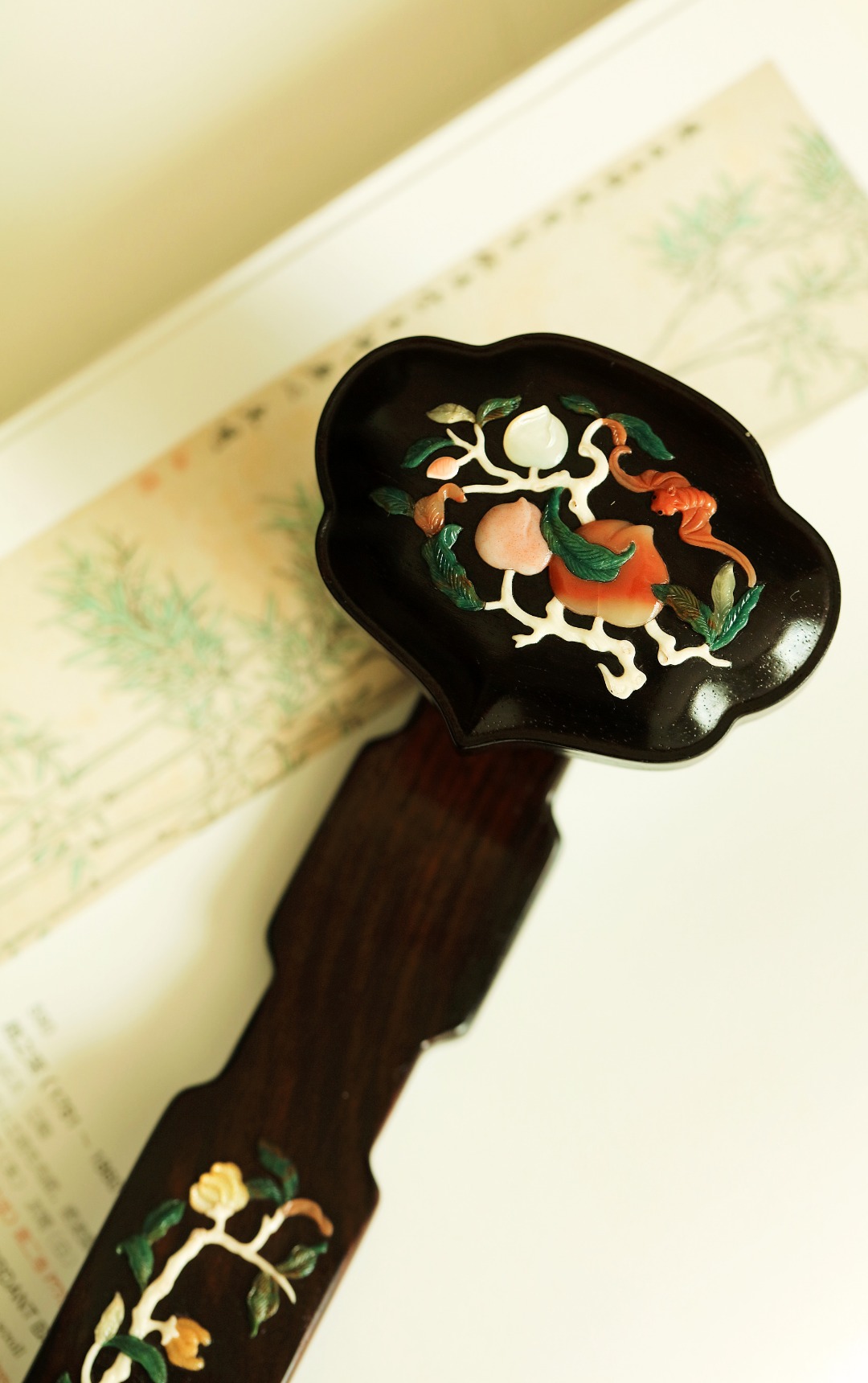 酸枝老料作如意式。色泽莹润。面饰百宝嵌,佛手、蟠桃、石榴,维妙维肖,案头陈设,文气十分。