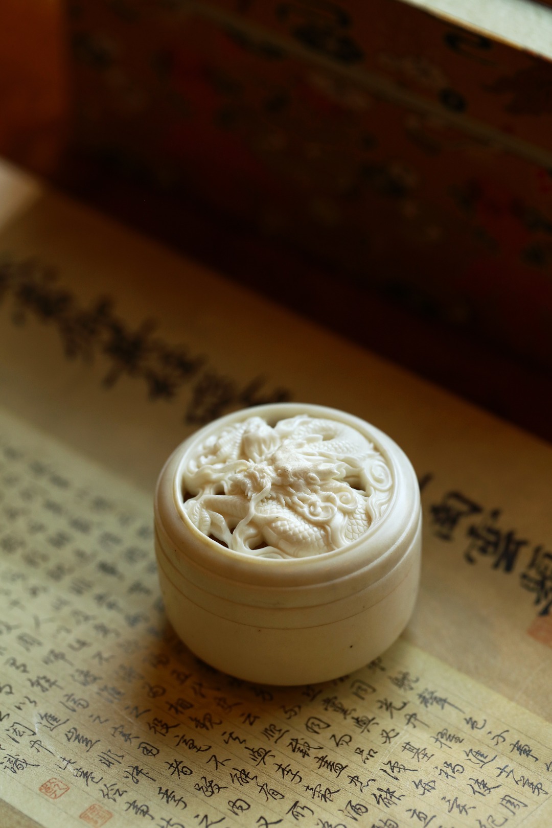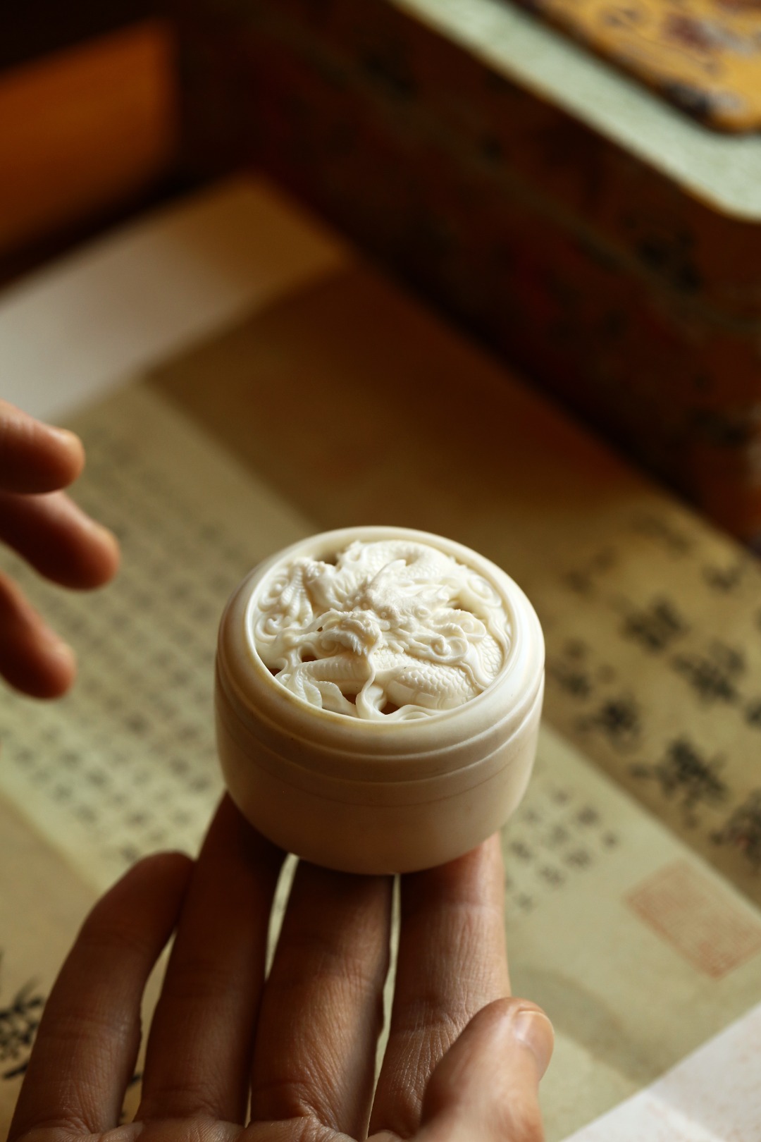 择料清润,炉盖镂空雕刻祥龙,刀法细腻,展玩在目,佳寓涵藏,焚香幽幽,清趣丛生。
