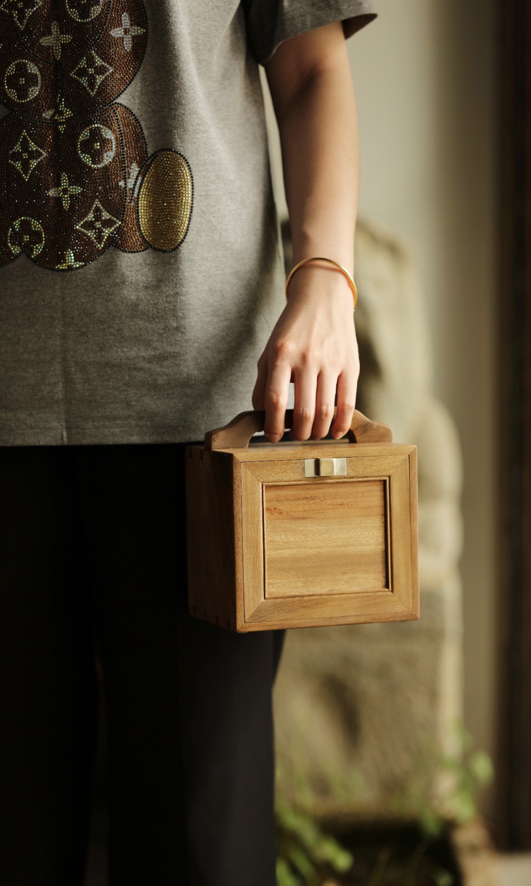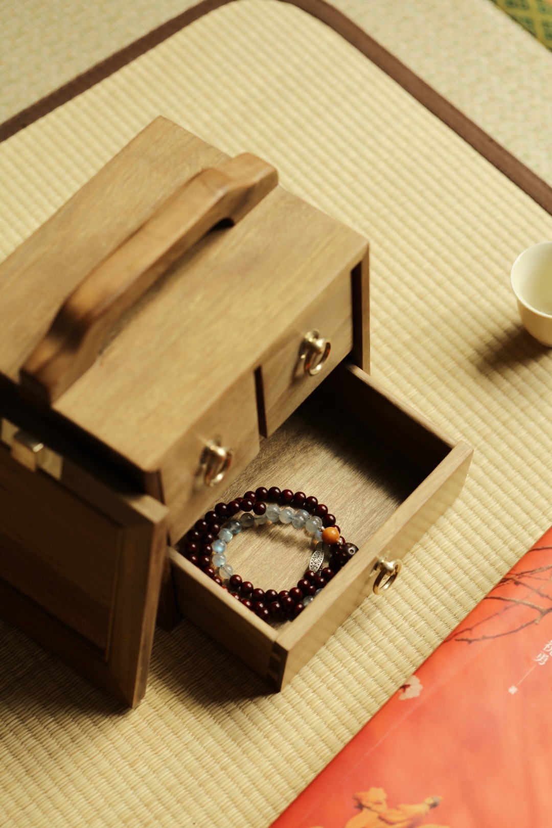 择拆房老料,楠香四溢,整器榫卯精工,工艺考究,提梁趁手,内设多格,收纳雅物珍玩,古韵十分。